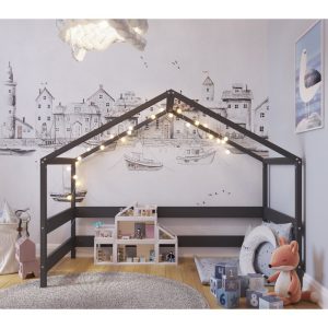 Patut tip casuta YappyHytte Bed din lemn certificat FSC transformabil in casuta de joaca cu bariera de protectie in stil scandinav 160×80 cm gri Yappy