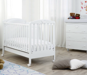 Patut din lemn cu roti Timmi Heart Qmini 120×60 cm din lemn de pin si mdf somiera reglabila alb + Saltea 8 cm