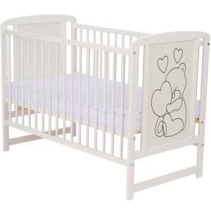 Patut din lemn cu roti Timmi Heart Qmini 120×60 cm cu laterala culisanta din lemn de pin si mdf somiera reglabila alb + Saltea 10 cm