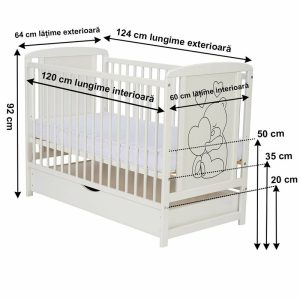 Patut din lemn cu roti Timmi Heart Qmini 120×60 cm cu laterala culisanta din lemn de pin si mdf somiera reglabila alb + Saltea 12 cm