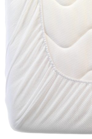 Patut din lemn masiv 120×60 cm Bria alb cu roti, include saltea cocos 8 cm, protectie impermeabila si set lenjerie matlasata 5 piese Kidizi