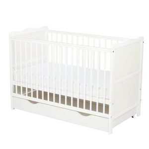 Patut din lemn masiv 120×60 cm Bria alb cu sertar bariera cu saltea de 8 cm