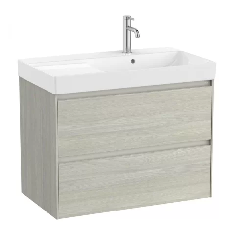 Set PROMO mobilier baza si lavoar cu polita stanga Roca Ona Unik 2 sertare 80×46 cm stejar deschis