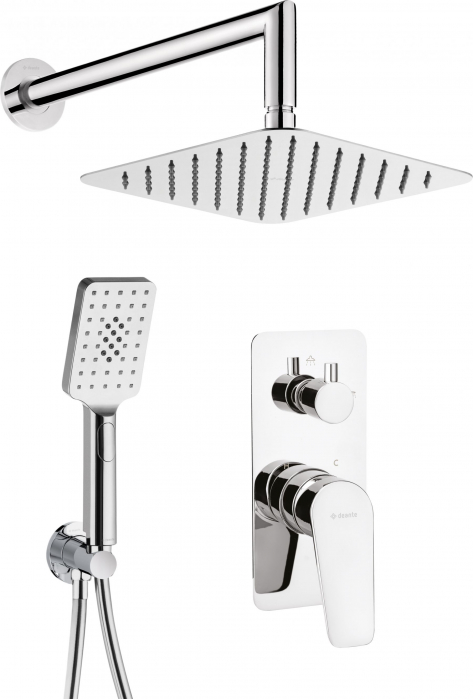 Set dus incastrat culoare crom lucios cu palarie patrata de dus Deante, Jasmin Dus mobil cu 3 functii: flux mixt, flux de ploaie, flux de ceata de apa; Dimensiune dus mobil: 260×80 mm. Furtun din PVC: 1500 mm; Furtun cu doua varfuri conice…