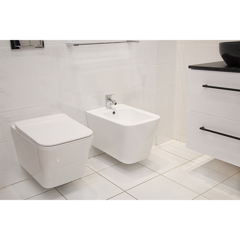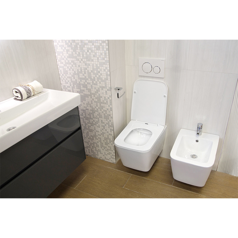vas WC suspendat cu evacuare orizontala prindere ascunsa, nu sunt suruburi vizibile si nici capacele de protectie pe suprafata ceramicii; forma: dreptunghiulara produsul se fixeaza pe perete vas wc rimless, vezi explicarea termenilor culoare: alb dimensiune: 52,5 x 36,5 cm material: ceramica sanitara se livreaza impreuna cu capac (din duroplast) cu quick release si soft close, vezi explicarea termenilor Explicarea termenilor: Rimless=Rimfree=Pur Rime=Direct Flush: vasele WC fabricate in tehnologia rimfree, nu au rama interioara (sunt „rimless”). Jetul de apa este astfel directionat incat spala perfect, dar nu stropeste in afara vasului. Neexistand nici un sant in interiorul vasului, acesta se curata complet. Practic aceasta tehnologie elimina spatiile greu acesibile, greu de curatat din corpul vasului de toaleta. Quick Release: capacele WC cu tehnologia Quick Release pot fi demontate si montate la loc prin doar cateva miscari. Astfel, capacul WC poate fi curatat usor avand acces in toate zonele greu de curatat Soft Close: datorita amortizoarelor speciale integrate in balamale, capacele WC cu tehnologia „Soft close” (inchidere lenta), se inchid usor si silentios. Acest lucru imbunatateste comfortul si previne zgomotele generate de trantirea capacului WC. Avantaje: inchiderea silentioasa a capacului WC si prevenirea accidentelor cauzate de trantirea capacului. Despre brand: Brandul Fluminia constă într-o varietate de forme și modele de lavoare, oglinzi și ventile. Acesta ne impresioneaza prin echilibrul celor 3 caracteristici: design, calitate si pret accesibil.
