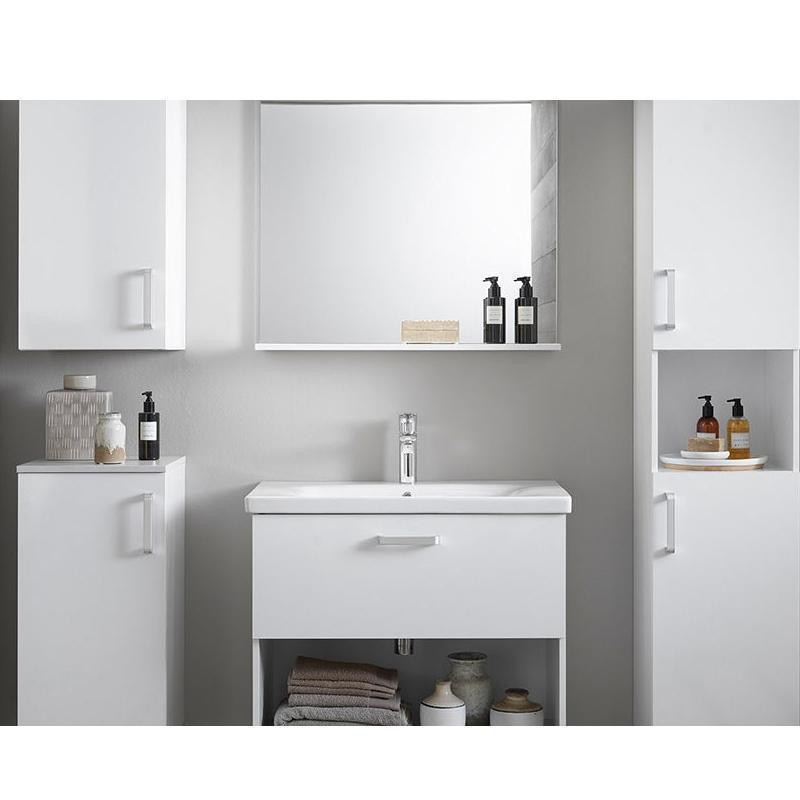 Caracteristici: oglinda dreptunghiulara dimensiune: 80 x 70 x 14 (lungime x inaltime x adancime polita) oglinda cu polita material: PAL special acoperit cu folie culoare polita: alb spatiu de depozitare exterior cu 1 polita montaj: suspendat (pe perete) Compatibilitate: culorile din imagini sunt orientative disponibil si in culoarea: gri oglinda se poate completa cu seturile de lavoar + mobilier si coloana Evelin (vezi produse recomandate)