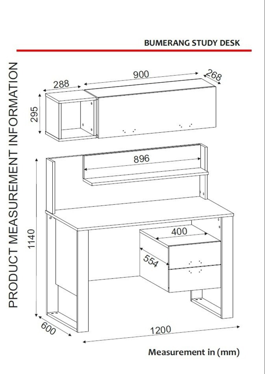 <p>Setul este format din birou: 120 x 60 x 114 cm (Lxlxh) si raft pentru perete: 118.8 x 26.8 x 29.5 cm (Lxlxh).<br />Compozitie material: pal melaminat.<br />Grosime: 1.8 cm.</p>