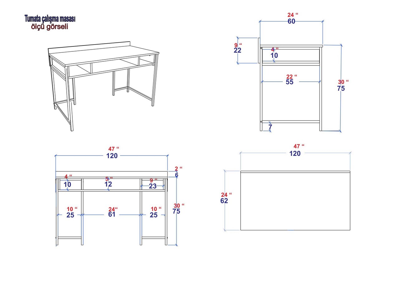<p>PAL<br/><br/>Grosime: 18 mm<br/><br/>Picioare metalice<br/><br/>Latime: 120 cm <br/>Inaltime: 75 cm <br/>Adancime: 60 cm<br/><br/>Înălțimea raftului de sub birou: 12 cm<br/><br/>Spatiu de depozitare suplimentar<br/></p>