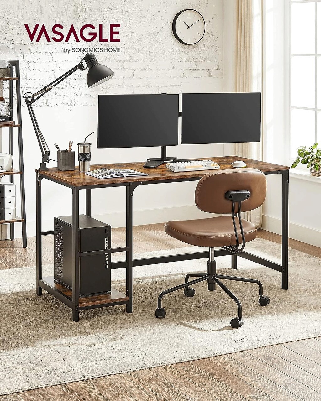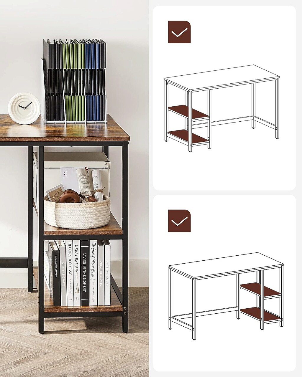 <p>Rafturi de depozitare flexibile: 2 rafturi de depozitare, dintre care unul este detasabil, pot fi instalate in dreapta sau in stanga, dupa cum aveti nevoie. In plus, puteti indeparta raftul din mijloc pentru a se potrivi calculatorul dvs. sau il puteti pastra pentru a depozita carti, documente sau alte obiecte frecvent utilizate.<br />Placile aglomerate de calitate fac ca biroul si rafturile de depozitare ale acestuia sa fie rezistente la uzura, durabile si usor de curatat.<br />Cadrul robust din otel intarit de barele transversale inferioare asigura stabilitatea si durabilitatea.<br />Picioarele reglabile asigura stabilitatea biroului pe podele denivelate si va protejeaza podeaua de zgarieturi.</p>