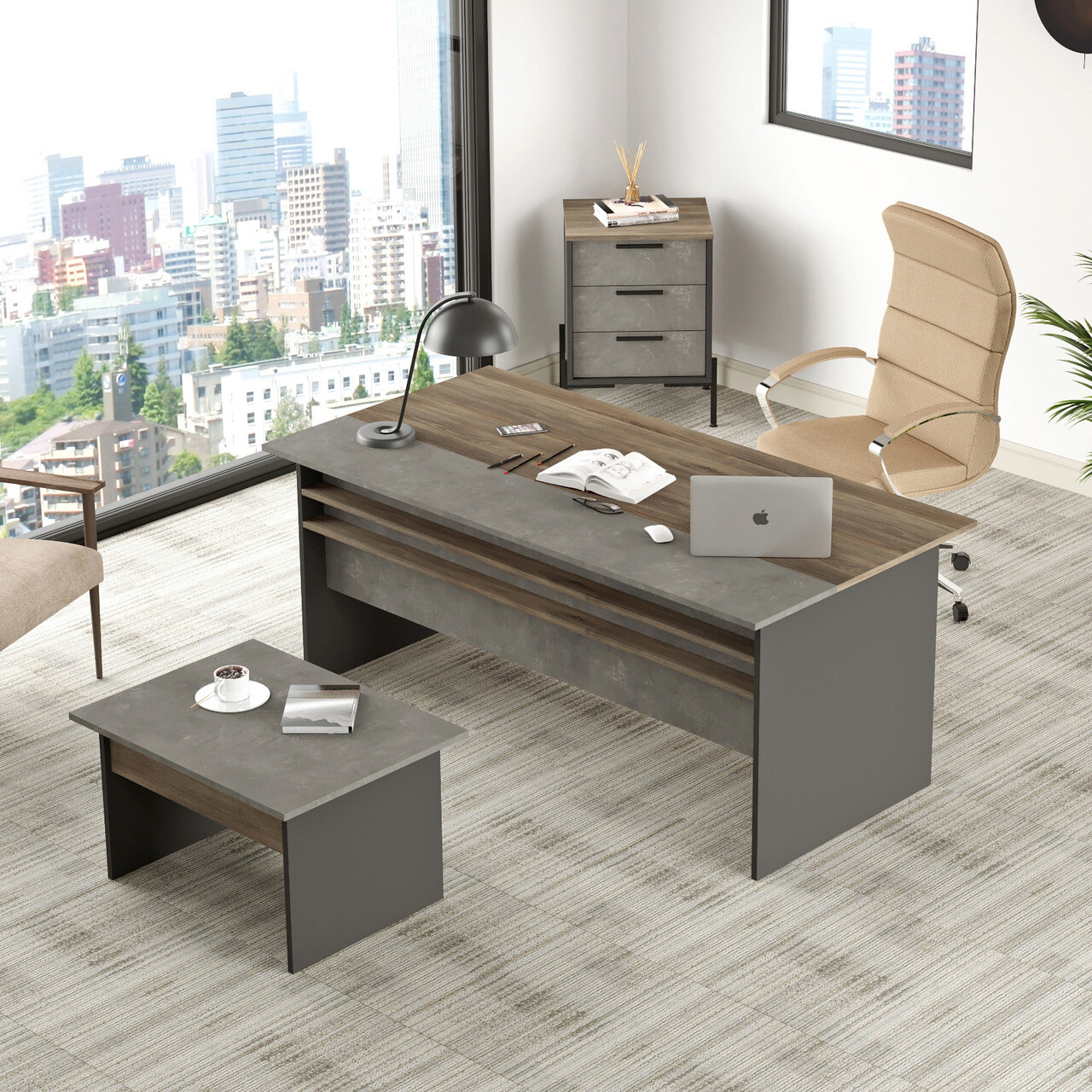 <p>PAL<br/><br/>Grosime:18 mm<br/><br/>Cadru metalic<br/><br/>Birou: Latime: 180 cm <br/> Inaltime: 75 cm <br/> Adancime: 89,5 cm<br/><br/>Masute: Latime: 80 cm <br/> Inaltime: 46,3 cm <br/> Adancime: 60 cm<br/><br/>Dulapior: Latime: 54 cm <br/> Inaltime: 70 cm <br/> Adancime: 44,5 cm<br/></p>
