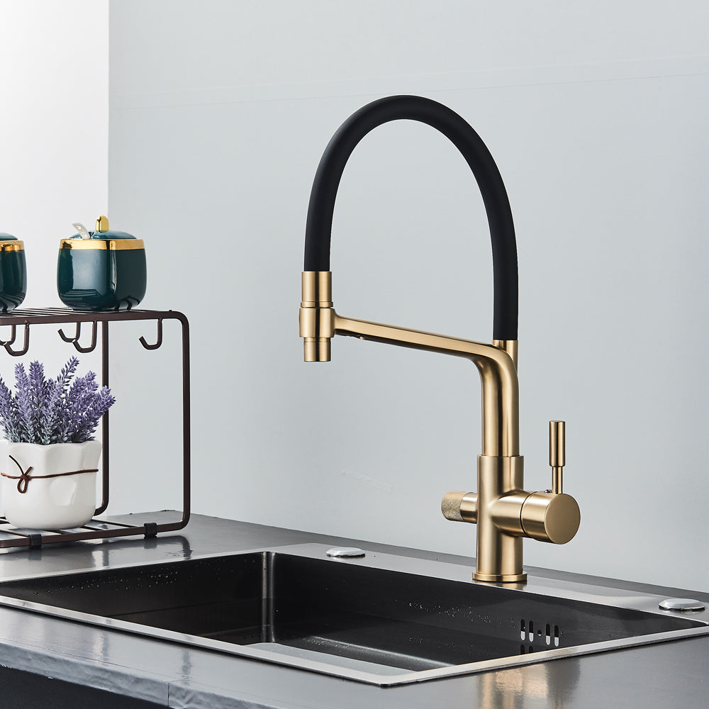 Baterie bucatarie cu 3 cai pentru filtru de purificare și 2 funcții de curgere a apei, auriu cu negru, cod 1533