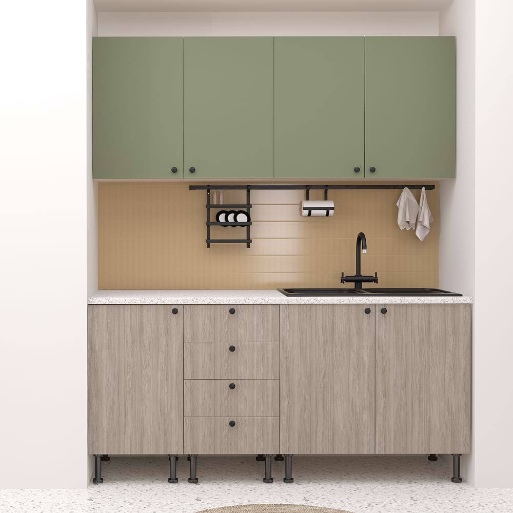 <p>DOMINO – sistem modular de bucatarie</p><p>Mobila de bucatarie DOMINO A180 cm, cu carcasa din PAL Vizon, fronturi PAl melaminat Oak, Pesto, blat termic este fabricata de TAMOS .</p><p>Bucatarie configurabila! </p><ul><li>configurezi materialele, decor fronturi, decor blat</li><li>configurezi manere</li><li>configurezi accesorii</li><li>configurezi dimensiune </li></ul><p><span style="color: rgb(227, 108, 9);">NOTA</span>: In cazul in care se configureaza bucataria din mai multe corpuri individuale ce fac parte din </p><p> Colectia DOMINO, se poate opta pentru blat, plinta, inaltator blat pe toata lungimea compozitiei, </p><p> in limitele constructive ale materialelor sau ale capacitatii de transport.</p><p>Mobilier kit, se livreaza demontat, ambalat in cutii de carton</p><p> Materiale:</p><ul><li>Carcasa corpuri – PAL melaminat Vizon 16mm</li><li>Fronturi – PAL melaminat Oak, Pesto 16mm</li><li>Spate – PFL melaminat 2,5mm</li><li>Balamale Hafele Metallamat cu amortizare – Germania</li><li>Picioare reglabile PVC H15cm cu sistem de prindere plinta Hafele – Germania </li><li>Sistem de conectori Hafele – Germania</li><li>Butoni sau manere conform configurator ( butoni negri sau crom – varianta de baza)</li><li>Blat termic 2,8cm grosime Tehnotop (varianta baza) si 3,8cm grosime (varianta optionala)</li><li>Cant ABS 0,4mm – carcasa</li><li>Cant ABS 1mm – fronturi</li></ul><ul><li>Lungime – 180cm</li><li>Adancime carcasa 50cm</li><li>Adancime blat 60cm</li><li>Inaltime corpuri inferioare (inclusiv picioarele reglabile de H15cm) – 88-90cm </li><li>Inaltime corpuri superioare – 70cm </li></ul><p><span style="font-size: small; font-family: arial, helvetica, sans-serif;"></span></p><p>Blaturile de lucru Tehnotop sunt confecționate din plăci de PAL ale căror suprafețe sunt acoperite cu laminat prin presare și termoformare. Blaturile sunt optionale si sunt contra cost. </p><p>Sunt recomandate pentru întrebuințări multiple, atât în bucătărie cat și în alte zone, pentru amenajări care implică suprafețe cu proprietăți specifice de rezistență și durabilitate.</p><ul><li>Postforming – profil tip “U” întărit cu MDF pentru rezistență la impact</li><li>hârtie balans rezistentă sporită la umiditate</li><li>antistrop cu adeziv poliuretanic topit pentru sigilarea îmbinării</li><li>rezistență mare la abraziune și durabilitate</li></ul><p>Garantie 24 luni</p><ul><li>Transport GRATUIT in toata tara. Produsele se preiau de la masina.</li></ul><p><span style="color: rgb(31, 73, 125);">*Chiuveta, bateria,blatul, panoul de peretele precum si celelalte accesorii din imagine nu sunt incluse in pret</span><br></p>