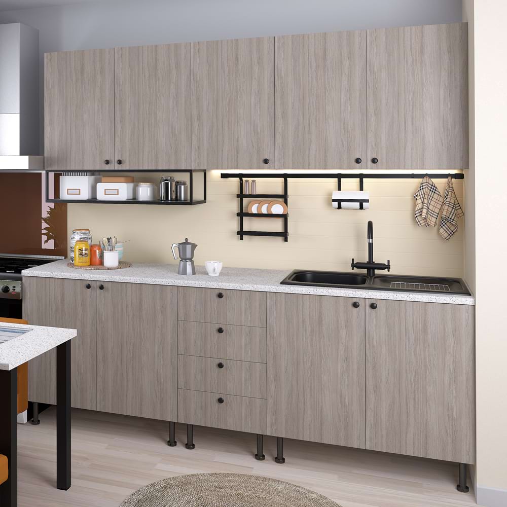 <p>DOMINO – sistem modular de bucatarie</p><p>Mobila de bucatarie DOMINO A225cm, cu carcasa din PAL Vizon, fronturi din PAL Oak, blat termic este fabricata de TAMOS .</p><p>Bucatarie configurabila! </p><ul><li>configurezi materialele, decor fronturi, decor blat</li><li>configurezi manere</li><li>configurezi accesorii</li><li>configurezi dimensiune </li></ul><p><span style="color: rgb(227, 108, 9);">NOTA</span>: In cazul in care se configureaza bucataria din mai multe corpuri individuale ce fac parte din </p><p> Colectia DOMINO, se poate opta pentru blat , plinta , inaltator blat pe toata lungimea compozitiei, </p><p> in limitele constructive ale materialelor sau ale capacitatii de transport.</p><p>Mobilier kit, se livreaza demontat, ambalat in cutii de carton</p><p> Materiale:</p><ul><li>Carcasa corpuri – PAL melaminat Vizon 16mm</li><li>Fronturi – PAL melaminat Oak 16mm</li><li>Spate – PFL melaminat 2,5mm</li><li>Balamale Hafele Metallamat cu amortizare – Germania</li><li>Picioare reglabile PVC H15cm cu sistem de prindere plinta Hafele – Germania </li><li>Sistem de conectori Hafele – Germania</li><li>Butoni sau manere conform configurator ( butoni negri sau crom – varianta de baza)</li><li>Blat termic 2,8cm grosime Tehnotop (varianta baza) si 3,8cm grosime (varianta optionala)</li><li>Cant ABS 0,4mm – carcasa</li><li>Cant ABS 1mm – fronturi</li></ul><ul><li>Lungime – 225cm</li><li>Adancime carcasa 50cm</li><li>Adancime blat 60cm</li><li>Inaltime corpuri inferioare (inclusiv picioarele reglabile de H15cm) – 88-90cm </li><li>Inaltime corpuri superioare – 70cm </li></ul><p><span style="font-size: small; font-family: arial, helvetica, sans-serif;"></span></p><p>Blaturile de lucru Tehnotop sunt confecționate din plăci de PAL ale căror suprafețe sunt acoperite cu laminat prin presare și termoformare. Blaturile sunt optionale si sunt contra cost. </p><p>Sunt recomandate pentru întrebuințări multiple, atât în bucătărie cat și în alte zone, pentru amenajări care implică suprafețe cu proprietăți specifice de rezistență și durabilitate.</p><ul><li>Postforming – profil tip “U” întărit cu MDF pentru rezistență la impact</li><li>hârtie balans rezistentă sporită la umiditate</li><li>antistrop cu adeziv poliuretanic topit pentru sigilarea îmbinării</li><li>rezistență mare la abraziune și durabilitate</li></ul><p>Garantie 24 luni</p><p>Servicii post vanzare</p><ul><li>Transport GRATUIT in toata tara. Produsele se preiau de la masina.</li></ul><p><span style="color: rgb(31, 73, 125);">*Chiuveta, bateria, blatul, panoul de peretele precum si celelalte accesorii din imagine nu sunt incluse in pret</span><br></p>