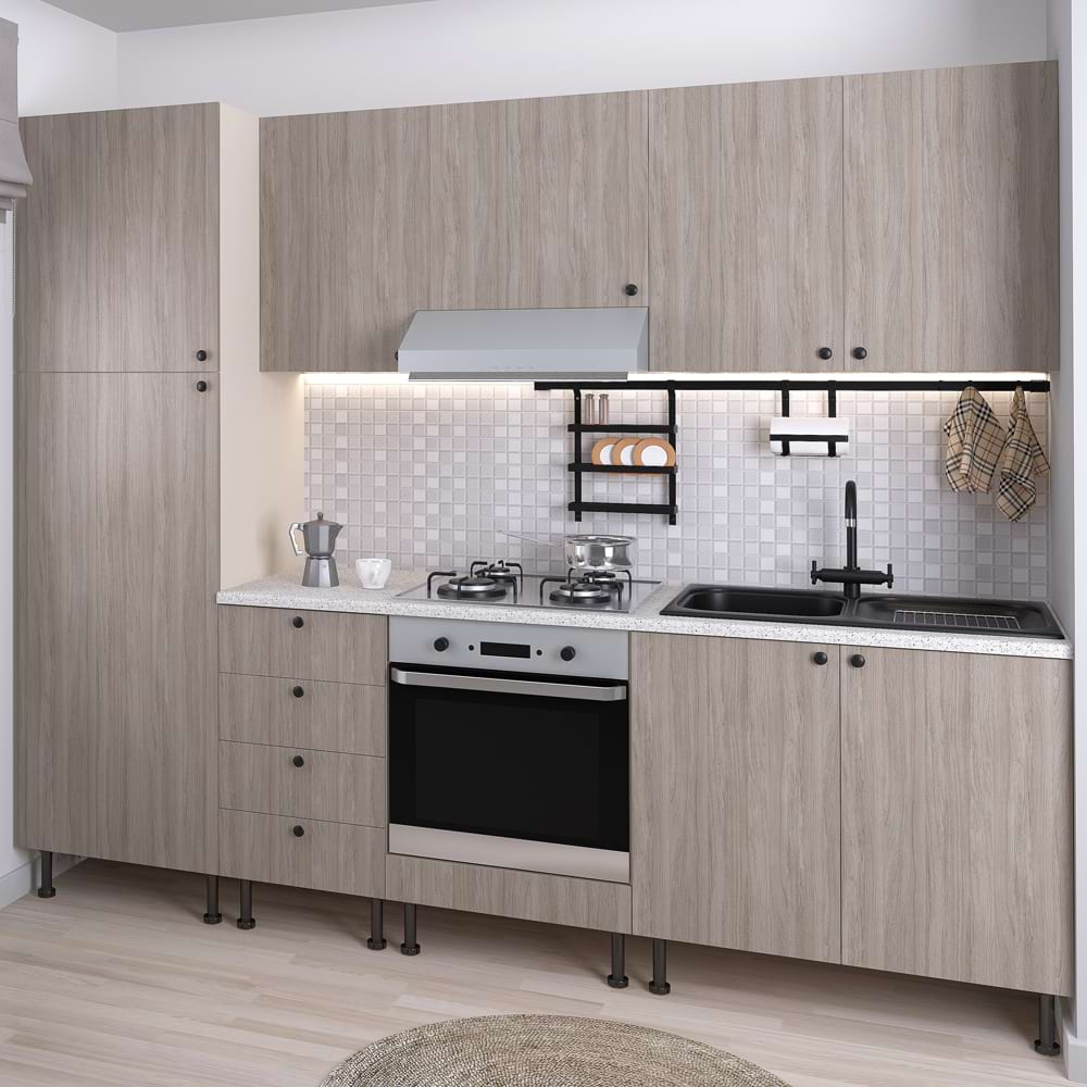 <p><strong><strong></strong></strong>DOMINO – sistem modular de bucatarie</p><p>Mobila de bucatarie DOMINO A255 cm, cu carcasa din PAL Vizon, fronturi PAL Oak, blat termic este fabricata de TAMOS .</p><p>Bucatarie configurabila! </p><ul><li>configurezi materialele, decor fronturi, decor blat</li><li>configurezi manere</li><li>configurezi accesorii</li><li>configurezi dimensiune </li></ul><p><span style="color: rgb(227, 108, 9);">NOTA</span>: In cazul in care se configureaza bucataria din mai multe corpuri individuale ce fac parte din </p><p> Colectia DOMINO, se poate opta pentru blat, plinta, inaltator blat pe toata lungimea compozitiei, </p><p> in limitele constructive ale materialelor sau ale capacitatii de transport.</p><p>Mobilier kit, se livreaza demontat, ambalat in cutii de carton</p><p> Materiale:</p><ul><li>Carcasa corpuri – PAL melaminat Vizon 16mm</li><li>Fronturi – PAL melaminat Oak 16mm</li><li>Spate – PFL melaminat 2,5mm</li><li>Balamale Hafele Metallamat cu amortizare – Germania</li><li>Picioare reglabile PVC H15cm cu sistem de prindere plinta Hafele – Germania </li><li>Sistem de conectori Hafele – Germania</li><li>Butoni sau manere conform configurator ( butoni negri sau crom – varianta de baza)</li><li>Blat termic 2,8cm grosime Tehnotop (varianta baza) si 3,8cm grosime (varianta optionala)</li><li>Cant ABS 0,4mm – carcasa</li><li>Cant ABS 1mm – fronturi</li></ul><ul><li>Lungime – 255cm</li><li>Adancime carcasa 50cm</li><li>Adancime blat 60cm</li><li>Inaltime corpuri inferioare (inclusiv picioarele reglabile de H15cm) – 88-90cm </li><li>Inaltime corpuri superioare – 70cm </li></ul><p><span style="font-size: small; font-family: arial, helvetica, sans-serif;"></span></p><p>Blaturile de lucru Tehnotop sunt confecționate din plăci de PAL ale căror suprafețe sunt acoperite cu laminat prin presare și termoformare. Blaturile sunt optionale si sunt contra cost. </p><p>Sunt recomandate pentru întrebuințări multiple, atât în bucătărie cat și în alte zone, pentru amenajări care implică suprafețe cu proprietăți specifice de rezistență și durabilitate.</p><ul><li>Postforming – profil tip “U” întărit cu MDF pentru rezistență la impact</li><li>hârtie balans rezistentă sporită la umiditate</li><li>antistrop cu adeziv poliuretanic topit pentru sigilarea îmbinării</li><li>rezistență mare la abraziune și durabilitate</li></ul><p>Garantie 24 luni</p><ul><li>Transport GRATUIT in toata tara. Produsele se preiau de la masina.</li></ul><p><span style="color: rgb(31, 73, 125);">*Chiuveta, bateria, blatul, panoul de peretele precum si celelalte accesorii din imagine nu sunt incluse in pret.</span></p>