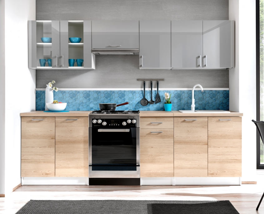 Bucatarie 2.6 m lungime blatul este inclus FRANȚE DE PLACĂ LAMINATĂ – 18 mm grosime, acoperite cu margine PVC MÂNERE Standard din plastic de culoare arginti DULAPURI SUPERIOARE inaltime 60 cm adancime 32 m DULAPURI INFERIOARE inaltime 82 cm adancime 46 cm dulapuri superioare: gri lucios dulapuri inferioare: fag artizanal Blatul nu este inclus in…