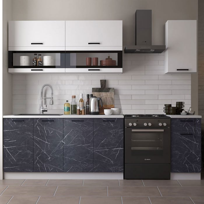 Set Bucatarie TEHNO NEW, L 200, 6 corpuri, blat termorezistent, corp alb lucios, fronturi marmura + alb