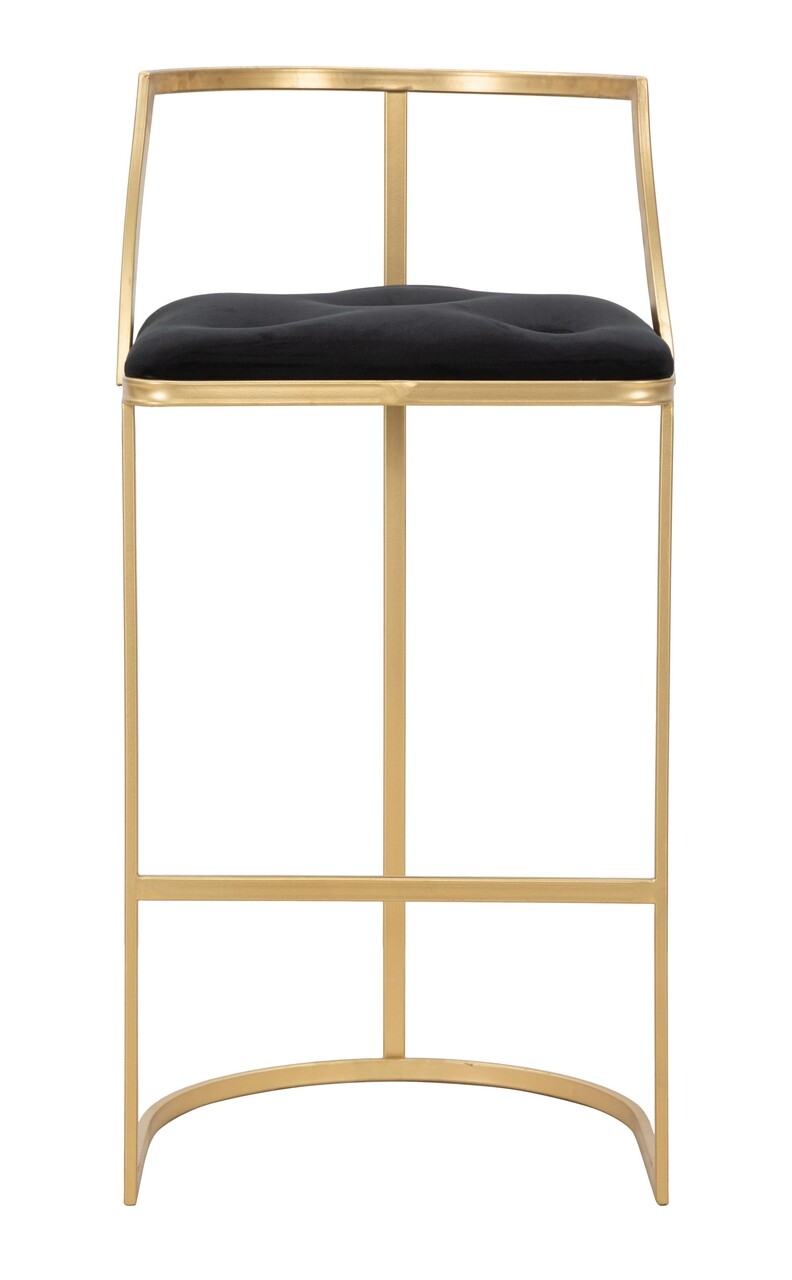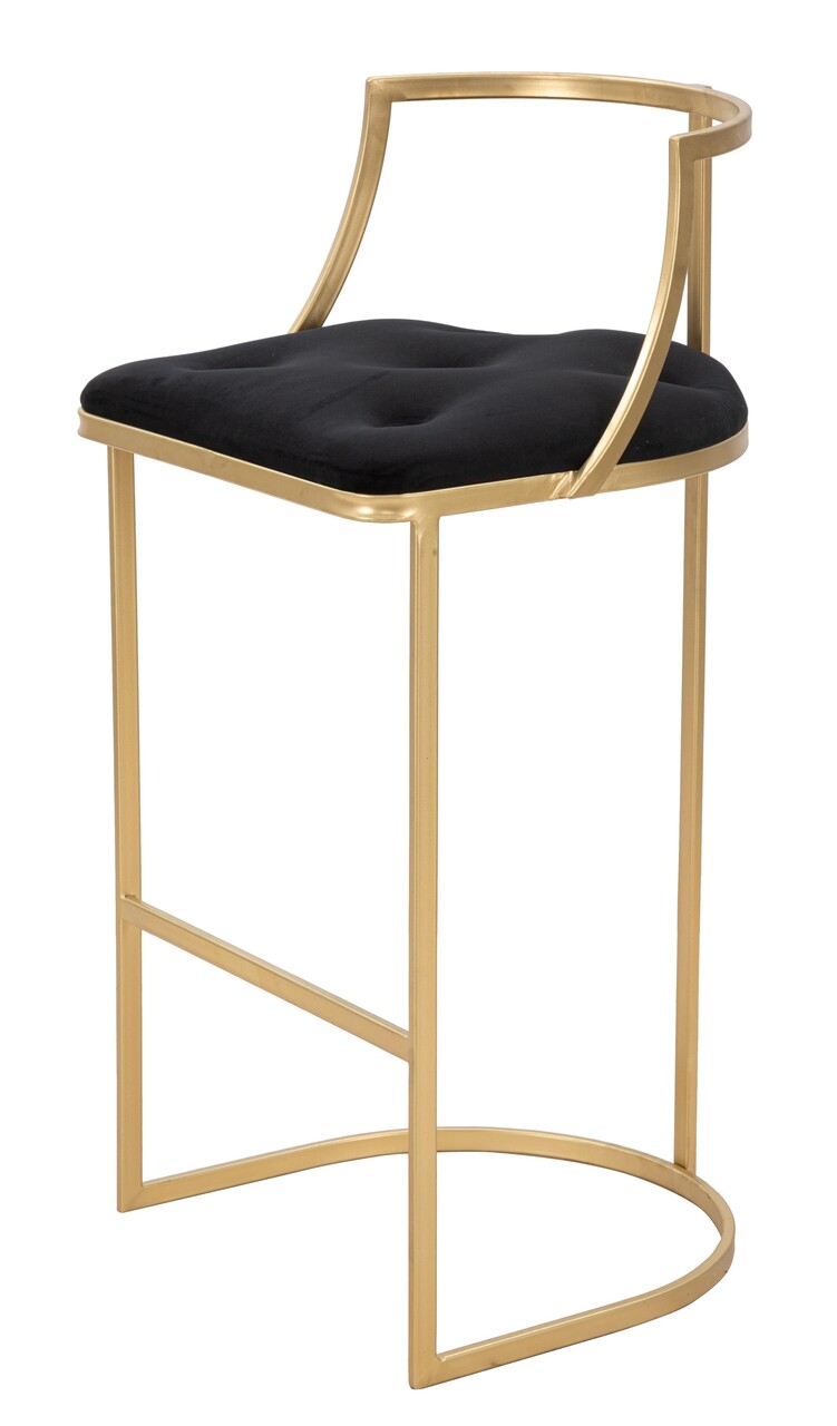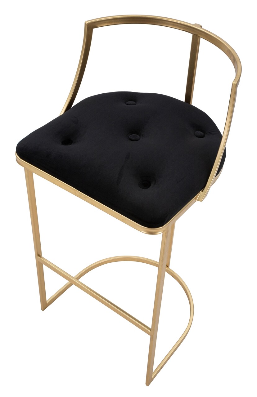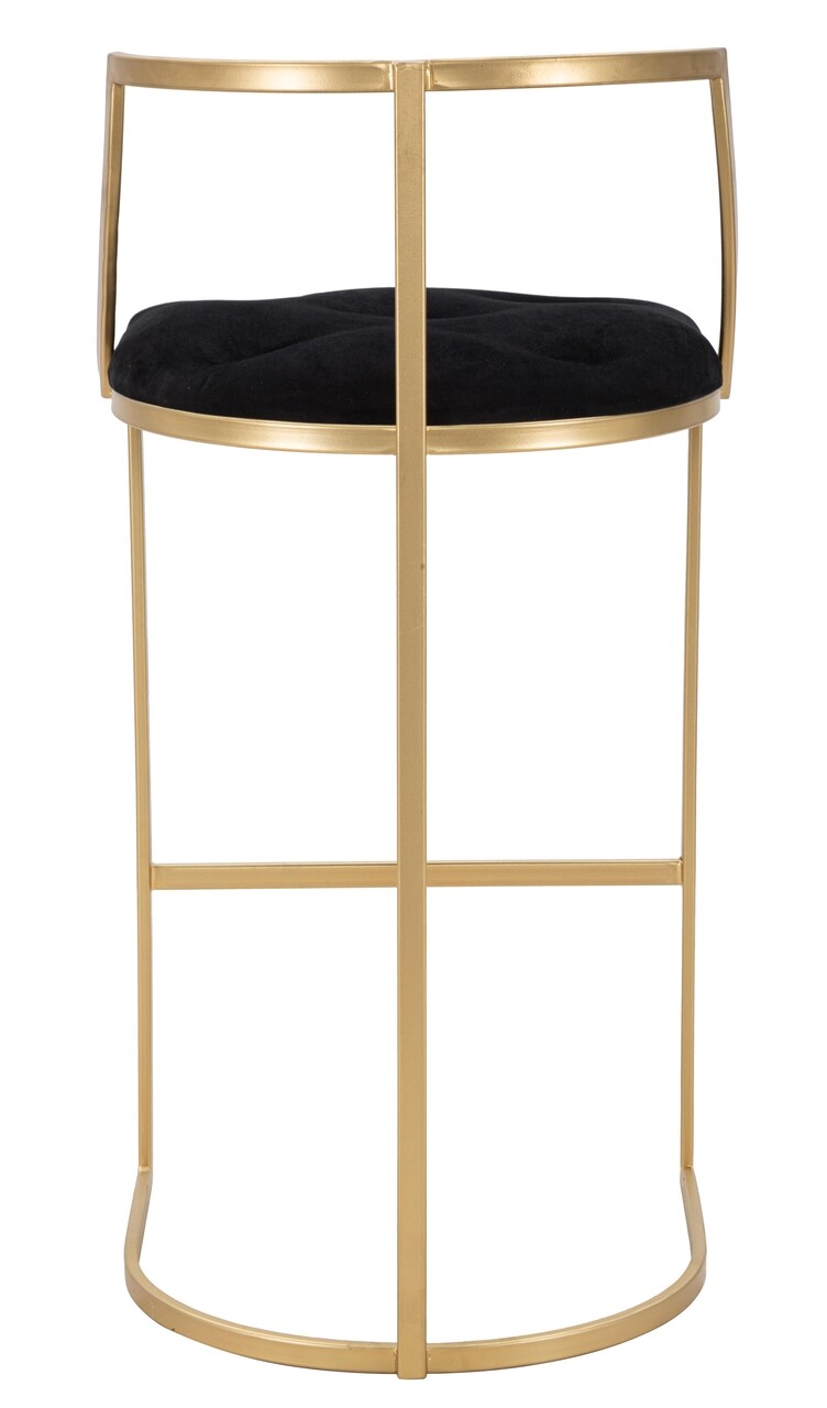 <p>Scaun de bar din metal auriu cu spatar. Scaunul este realizat din catifea sintetica captusita. Liniile simple si geometrice il fac perfect pentru orice tip de mobilier. <br /><strong>Caracteristici:</strong><br />Inaltime sezut: 67 cm<br />Inaltime suport picioare: 25 cm<br />Compozitie material: structura din fier, umplutura din burete, tapiterie din poliester cu aspect de catifea</p>