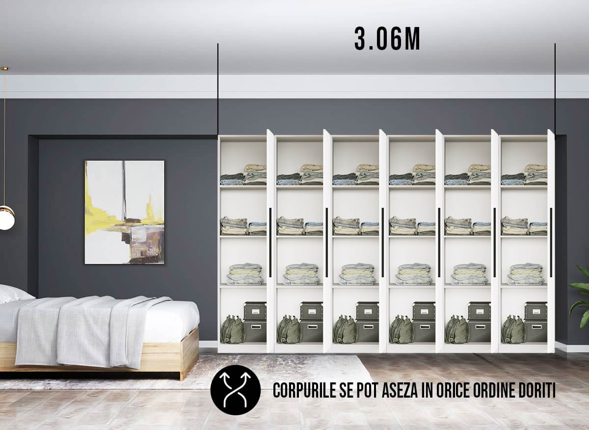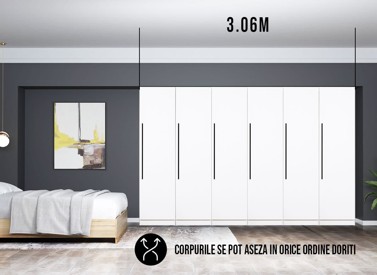 Dressing 3.06m / Dulap Dormitor Timea din familia Timea au aparut in urma emisiunii Visuri la Cheie de pe PRO TV in care Mobila Laguna a fost partener in 2019. Dulapul / Dressingul din acest set a primit un numar mare de solicitari din partea telespectatorilor si de aici a pornit crearea unui dormitor complet cu dressing modular ce poate ajunge chiar si pana la 5m.  Vedeti poza dulapului din cadrul emisiunii – Click aici . Acestea sunt construite din  PAL Kronospan melaminat cu finisaj Stejar Auriu, care creeaza un ambient placut. Cantul aplicat este unul de 0,6 care le permite  muchiilor sa fie plăcute la atingere  fiind finisate si atent retusate. Livrare Gratuita prin flota proprie Suntem producatori de mobilier Toate corpurile au o garantie de 2 ani Video de prezentare familie Videoul de prezentare poate contine mai multe corpuri de mobilier sau mai putine in comparatie cu produsul de pe aceasta pagina. Scopul acestui video este de a detalia aspectul materialelor, accesoriilor cat si a familiei din care face parte. Dressing 3.06m / Dulap Dormitor Timea Dulapul este compartimentat cu 6 corpuri dulap 0.51 m ce au in total 24 etajere cu 6 usi mari Este spatios iar dimensiunile sunt gandite cat sa incapa si in camere mai putin inalte sau mansarde. Se pot pune atat obiecte decorative cat si haine. Latime: 306 cm Adâncime: 53 cm Înălțime: 199 cm Combinatia intre alb si manerele negre usor lucioase creaza un echilibru placut in orice dormitor. Dressing 3.06m / Dulap Dormitor Timea Schita de Montaj Dulap 1 Usa Timea Pretul afisat nu include alte accesorii sau obiecte de decor (tablouri, elemente de iluminat, asternuturi, covor etc.) Produsul se livreaza demontat si este insotit de accesorii si instructiuni de asamblare. Dimensiunile sunt exprimate in cm si pot oscila intre ± 10 mm.