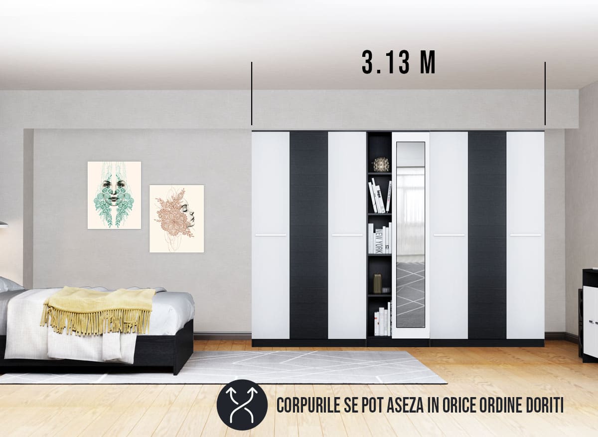 Dressing 3.13m / Dulap Dormitor Mario Dressing 3.13m / Dulap Dormitor Mario face parte din setul de dormitor Mario, acesta este format din corpuri modulare si dulapuri ce pot forma un dressing lungimi generoase. Acestea sunt construite din PAL melaminat de 16mm cu finisaj Ferrara si Alb Mat, o textura similara lemnului, care creeaza un contrast rafinat si un ambient placut. Cantul aplicat este unul de 0,6 care le permite muchiilor sa fie plăcute la atingere fiind finisate si atent retusate. Dulapurile sunt compartimentate cu polite/ etajere , cele cu 3 si 4 usi au bara de haine , cele cu o usa au etajere deschise si chiar si oglinda . Livrare Gratuita prin flota proprie Suntem producatori de mobilier Toate corpurile au o garantie de 2 ani Video de prezentare familie Videoul de prezentare poate contine mai multe corpuri de mobilier sau mai putine in comparatie cu produsul de pe aceasta pagina. Scopul acestui video este de a detalia aspectul materialelor, accesoriilor cat si a familiei din care face parte. Dressing 3.13m / Dulap Dormitor Mario Dulapul este format/compartimentat cu 2 x corp dulap 3 usi cu latimea 1.23 m ce are in total 5 etajere si 1 bara de haine 1 corp dulap 1 usa cu oglinda + polite cu latimea 0.66 m ce are in total 10 etajere Imaginea alaturata prezinta compartimentarea corpurilor din familia Mario Este spatios iar dimensiunile sunt gandite cat sa incapa si in camere mai putin inalte sau mansarde. Se pot pune atat obiecte decorative cat si haine. Acest produs se poate integra perfect in locuinta dumneavoastra si puteti crea un spațiu inteligent de depozitare. Dimensiuni totale – Latime: 312.6 cm Adancime: 55 cm Inaltime: 192 cm 2 x Dulap 3 usi – Latime: 123 cm Adancime: 48cm Inaltime: 192 cm Dulap 1 usa cu oglinda + polite – Latime: 66.6 cm Adancime: 48cm Inaltime: 192 cm Schita de Montaj Dulap Mario 3U Schita de Montaj Dulap Mario 1U Pretul afisat nu include alte accesorii sau obiecte de decor (tablouri, elemente de iluminat, asternuturi, covor etc.) Produsul se livreaza demontat si este insotit de accesorii si instructiuni de asamblare. Dimensiunile sunt exprimate in cm si pot oscila intre ± 10 mm.