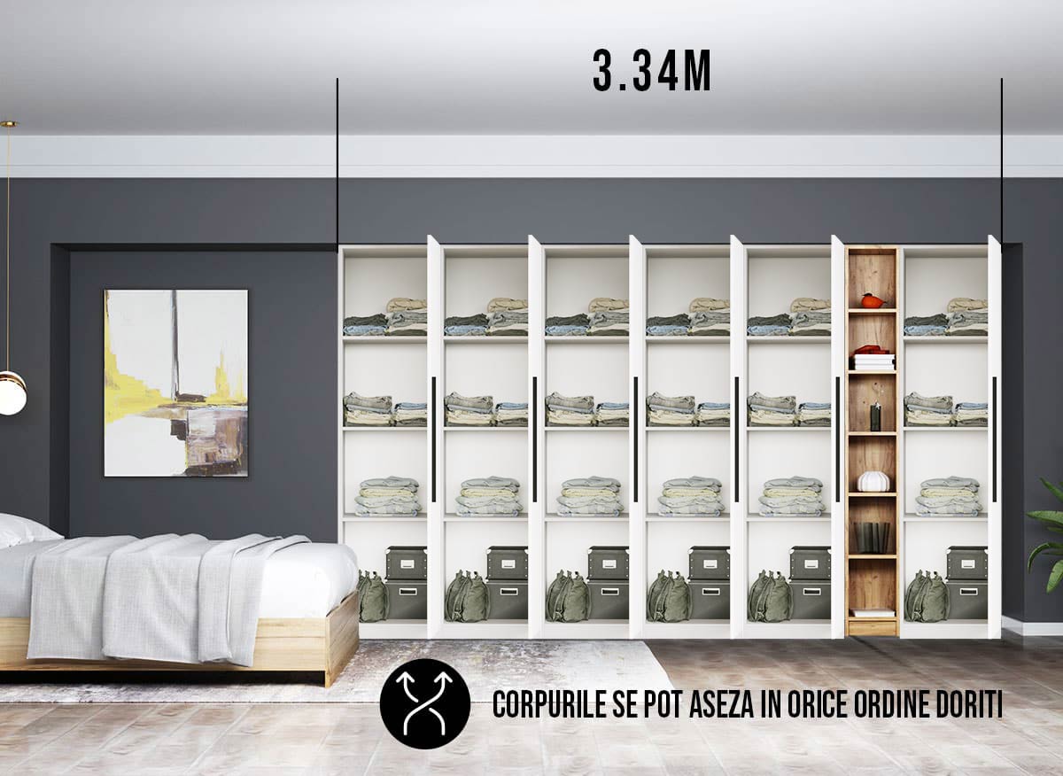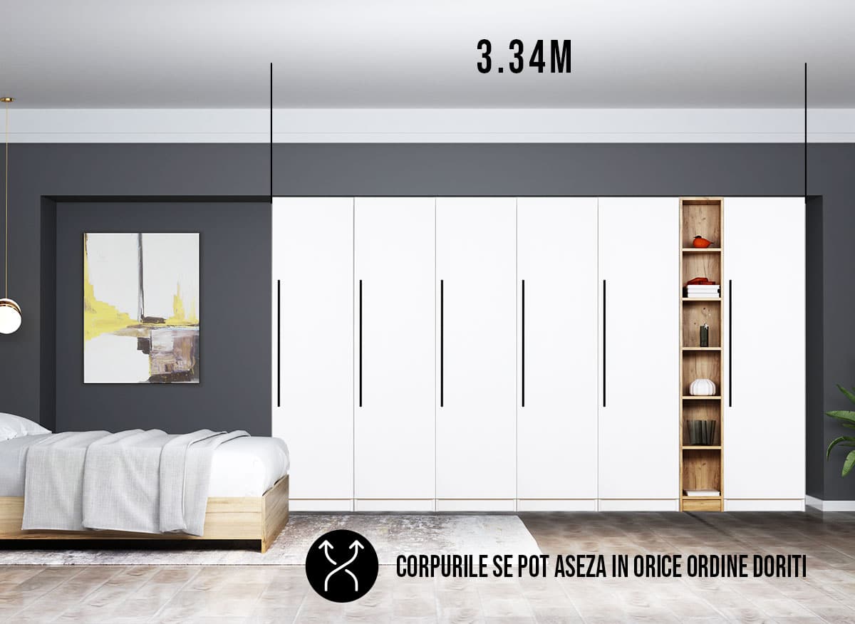 Dressing 3.34m / Dulap Dormitor Timea din familia Timea au aparut in urma emisiunii Visuri la Cheie de pe PRO TV in care Mobila Laguna a fost partener in 2019. Dulapul / Dressingul din acest set a primit un numar mare de solicitari din partea telespectatorilor si de aici a pornit crearea unui dormitor complet cu dressing modular ce poate ajunge chiar si pana la 5m. Vedeti poza dulapului din cadrul emisiunii – Click aici . Acestea sunt construite din PAL Kronospan melaminat cu finisaj Stejar Auriu, care creeaza un ambient placut. Cantul aplicat este unul de 0,6 care le permite muchiilor sa fie plăcute la atingere fiind finisate si atent retusate. Livrare Gratuita prin flota proprie Suntem producatori de mobilier Toate corpurile au o garantie de 2 ani Video de prezentare familie Videoul de prezentare poate contine mai multe corpuri de mobilier sau mai putine in comparatie cu produsul de pe aceasta pagina. Scopul acestui video este de a detalia aspectul materialelor, accesoriilor cat si a familiei din care face parte. Dressing 3.34m / Dulap Dormitor Timea Dulapul este compartimentat cu 6 corpuri dulap 0.51 m ce au in total 24 etajere cu 6 usi mari 1 corp etajera 0.28 m ce are in total 6 etajere mici deschise fara usa Atentie: corpul etajera are adancime de 33.6 cm iar dulapurile cu usi de 53 cm adancime. Este spatios iar dimensiunile sunt gandite cat sa incapa si in camere mai putin inalte sau mansarde. Se pot pune atat obiecte decorative cat si haine. Latime: 334 cm Adâncime: 53 cm Înălțime: 199 cm Combinatia intre alb, stejarul auriu si manerele negre usor lucioase creaza un echilibru placut in orice dormitor. Dressing 3.34m / Dulap Dormitor Timea Schita de Montaj Dulap 1 Usa Timea Schita de Montaj Dulap Raft Timea Pretul afisat nu include alte accesorii sau obiecte de decor (tablouri, elemente de iluminat, asternuturi, covor etc.) Produsul se livreaza demontat si este insotit de accesorii si instructiuni de asamblare. Dimensiunile sunt exprimate in cm si pot oscila intre ± 10 mm.