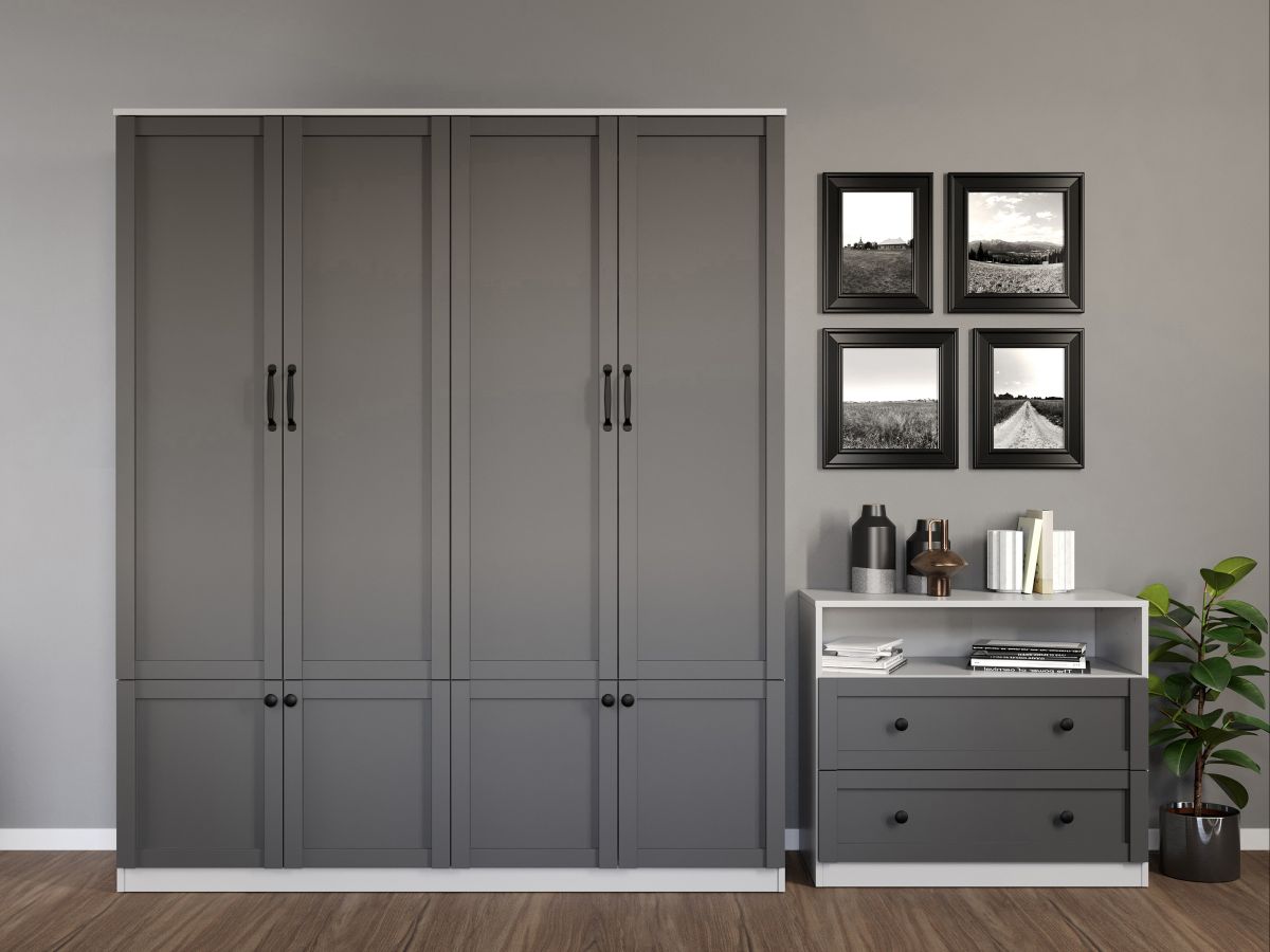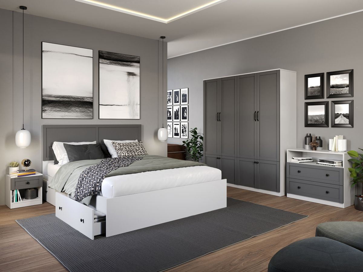 Dulap Grafit Gri/Alb – C164/01 Dulap complet alb, clasic si elegant. Dulap Grafit Gri/Alb – C164/01 nu se rezuma doar la aspect, ci are si o utilitate desavarsita, avand compartimentare cu: 4 polite + bara de haine in partea de sus 2 polite in partea de jos Finisajul palului Gri Antracit al fronturilor creeaza un ambient elegant si echilibrat in combinatie cu manerele negre mate si carcasa de dulap Alba . Are dimensiuni generoase, este spatios, iar inaltimea este conceputa cat sa incapa si in camere mai putin inalte sau in mansarde. SCHITA MONTAJ DULAP GRAFIT 164 Dimensiuni Dulap Grafit Gri/Alb – C164/01 Latime: 164.4 cm Adancime: 48 cm Inaltime: 192.5 cm Livrare Gratuita prin flota proprie Preturi de producator Toate corpurile au o garantie de 2 ani Video de prezentare familie Videoclipul de prezentare poate contine mai putine sau mai multe corpuri de mobilier in comparatie cu produsul de pe aceasta pagina. Scopul acestui video este de a detalia aspectul materialelor, accesoriilor cat si a familiei din care face parte. Dulap Grafit Gri/Alb Dulap Grafit Gri/Alb – C164/01 face parte din familia de mobila pentru dormitor Grafit ce are un aspect elegant si echilibrat combinand palul Alb al carcaselor si cel Gri Antracit al fronturilor cu manerele negre mate. Dulapurile au dimensiuni diverse si sunt proiectate pe 3 latimi , variante mai inguste pentru camere mici si medii si variante extinse pentru camere mai mari. Restul corpurilor de mobilier, comoda, noptierele si patul ofera la randul lor spatii de depozitare in completarea dulapului prin sertare . De asemenea puteti alege seturi cu pat ce au spatarul tapitat sau simplu cu dimensiunile de 140, 160 si 180×200 cm . Aveti posibilitatea de a adauga doua sau patru lazi de depozitare. Acestea sunt construite din PAL melaminat 16 mm cu finisaj Alb si Gri Antracit ce creeaza un ambient rafinat si un aspect placut. Cantul aplicat este unul de 0,6 ce le permite muchiilor sa fie placute la atingere fiind finisate si atent retusate. Pretul afisat nu include alte accesorii sau obiecte de decor (tablouri, elemente de iluminat, asternuturi, covor etc.) Produsul se livreaza demontat si este insotit de accesorii si instructiuni de asamblare. Dimensiunile sunt exprimate in cm si pot oscila intre ± 10 mm.