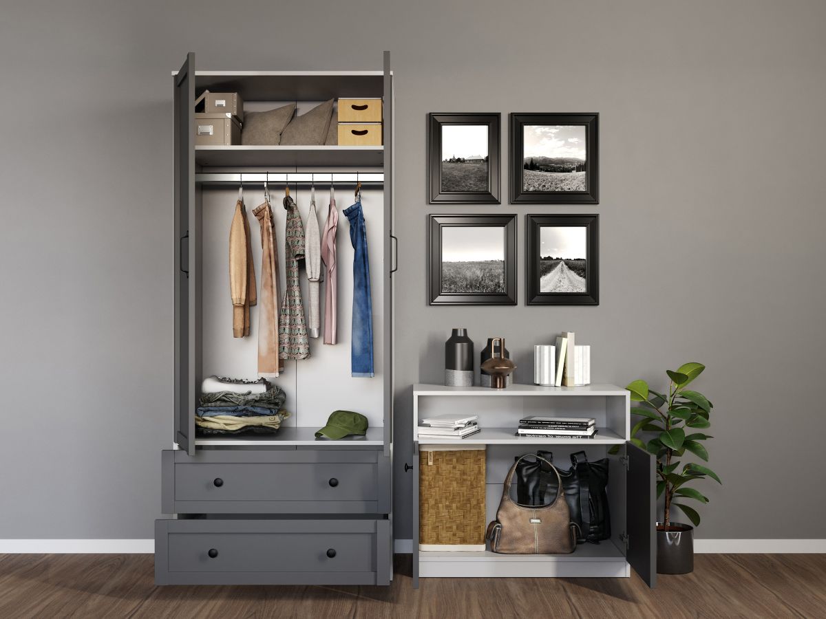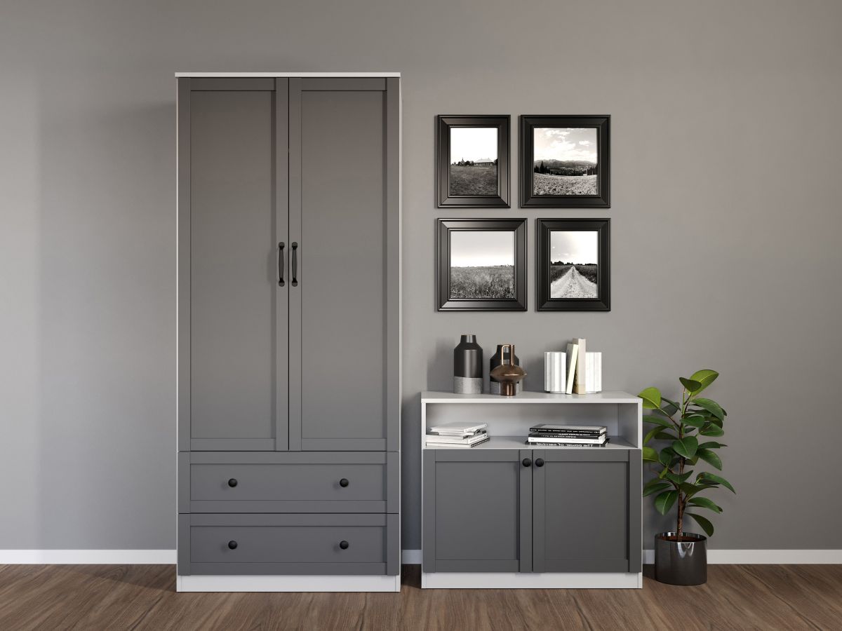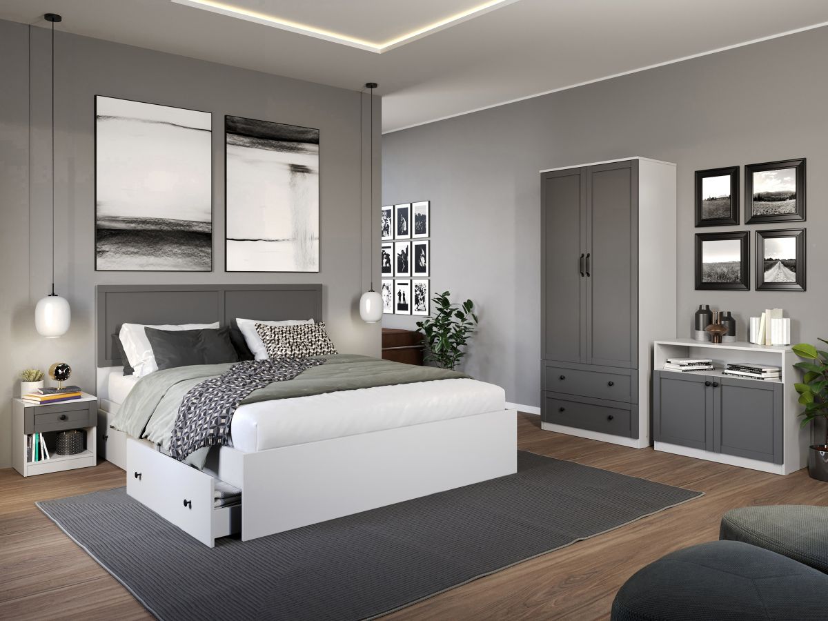 Dulap Grafit Gri/Alb – C83/02 Dulap complet alb, clasic si elegant. Dulap Grafit Gri/Alb – C83/02 nu se rezuma doar la aspect, ci are si o utilitate desavarsita, avand compartimentare cu: 2 polite + bara de haine in partea de sus 2 sertare in partea de jos Finisajul palului Gri Antracit al fronturilor creeaza un ambient elegant si echilibrat in combinatie cu manerele negre mate si carcasa de dulap Alba . Are dimensiuni generoase, este spatios, iar inaltimea este conceputa cat sa incapa si in camere mai putin inalte sau in mansarde. SCHITA MONTAJ DULAP GRAFIT 83 Dimensiuni Dulap Grafit Gri/Alb – C83/02 Latime: 83 cm Adancime: 48 cm Inaltime: 192.5 cm Livrare Gratuita prin flota proprie Preturi de producator Toate corpurile au o garantie de 2 ani Video de prezentare familie Videoclipul de prezentare poate contine mai putine sau mai multe corpuri de mobilier in comparatie cu produsul de pe aceasta pagina. Scopul acestui video este de a detalia aspectul materialelor, accesoriilor cat si a familiei din care face parte. Dulap Grafit Gri/Alb Dulap Grafit Gri/Alb – C83/02 face parte din familia de mobila pentru dormitor Grafit ce   are un aspect elegant si echilibrat combinand  palul Alb  al carcaselor si cel  Gri Antracit  al fronturilor cu  manerele negre  mate. Dulapurile au dimensiuni diverse si sunt proiectate pe 3 latimi , variante mai inguste pentru camere mici si medii si variante extinse pentru camere mai mari. Restul corpurilor de mobilier,  comoda, noptierele si patul  ofera la randul lor spatii de depozitare in completarea dulapului prin  sertare . De asemenea puteti alege seturi cu pat ce au spatarul tapitat sau simplu cu dimensiunile de  140, 160 si 180×200 cm . Aveti posibilitatea de a adauga doua sau patru lazi de depozitare. Acestea sunt construite din  PAL melaminat 16 mm cu finisaj Alb si Gri Antracit ce creeaza un ambient rafinat si un aspect placut. Cantul aplicat este unul de 0,6 ce le permite muchiilor sa fie placute la atingere  fiind finisate si atent retusate. Pretul afisat nu include alte accesorii sau obiecte de decor (tablouri, elemente de iluminat, asternuturi, covor etc.) Produsul se livreaza demontat si este insotit de accesorii si instructiuni de asamblare. Dimensiunile sunt exprimate in cm si pot oscila intre ± 10 mm.