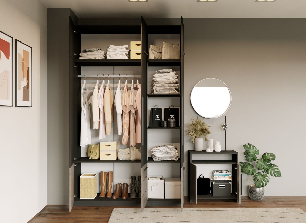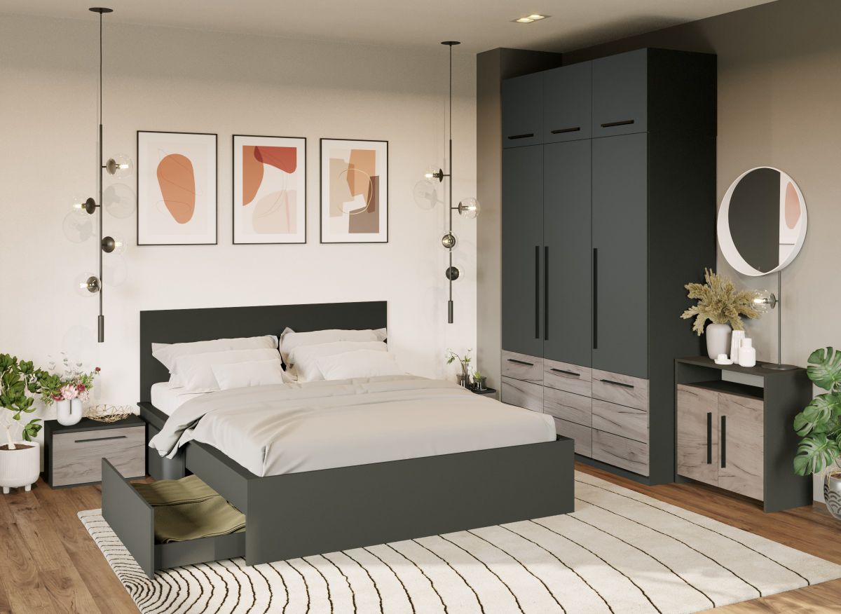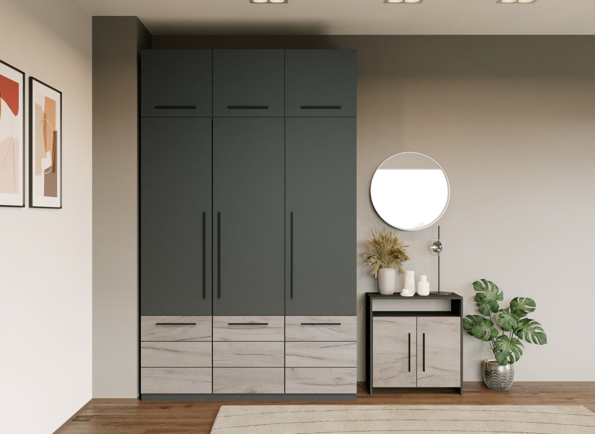 Dulap Inalt 1.51m Gri Noce Dulap Inalt 1.51m Gri Noce are 9 usi, iar interiorul este compartimentat cu 8 polite inchise si bara de umerase. Cu o inaltime de 2,48 metri , acest dulap este o solutie excelenta pentru a valorifica spatiul vertical, oferind mult spatiu de depozitare. Frezarile usilor de jos in combinatie cu decorul nature Stejar K02 dau un plus de stil. Finisajul gri antracit creeaza un ambient modern si atractiv. Este compus din: Dulap 1.51m – L 151 x A 53 x H 199cm – Schita Montaj Dulap suprapozabil 3U – L 151 x A 53 x H 49.2 cm – Schita Montaj Dimensiuni Dulap Inalt 1.51m Gri Lungime: 151 cm Adancime: 53 cm Inaltime: 248.2 cm Livrare rapida prin flota proprie Suntem producatori de mobilier Toate corpurile au o garantie de 2 ani Video de prezentare familie Videoul de prezentare poate contine mai multe corpuri de mobilier sau mai putine in comparatie cu produsul de pe aceasta pagina. Scopul acestui video este de a detalia aspectul materialelor, accesoriilor cat si a familiei din care face parte. Dulap Inalt 1.51m Gri Noce Dulap Inalt 1.51m Gri Noce face parte din familia de mobila pentru dormitor Noce . Mobileaza un dormitor rapid si usor. Are tot ce ii trebuie: noptiere, comoda, dulapuri de haine si pat tapitat sau netapitat. O solutie ideala pentru un dormitor matrimonial. Concepute pentru a optimiza spatiul, dulapurile se potrivesc atat camerelor joase sau mansardelor, cat si celor inalte. Un alt plus al acestui dormitor este dat de patul cu pana la 4 sertare pentru depozitare si tapiteria din piele pentru confort sporit. Acestea sunt construite din PAL Kronospan melaminat cu finisaj Gri Antracit si Stejar K02, o textura similara lemnului, care creeaza un contrast rafinat si un ambient placut. Cantul aplicat este unul de 0,6 ce le permite muchiilor sa fie placute la atingere fiind finisate si atent retusate. Pretul afisat nu include alte accesorii sau obiecte de decor (tablouri, elemente de iluminat, asternuturi, covor etc.) Produsul se livreaza demontat si este insotit de accesorii si instructiuni de asamblare. Dimensiunile sunt exprimate in cm si pot oscila intre ± 10 mm.
