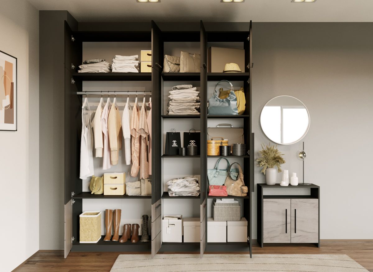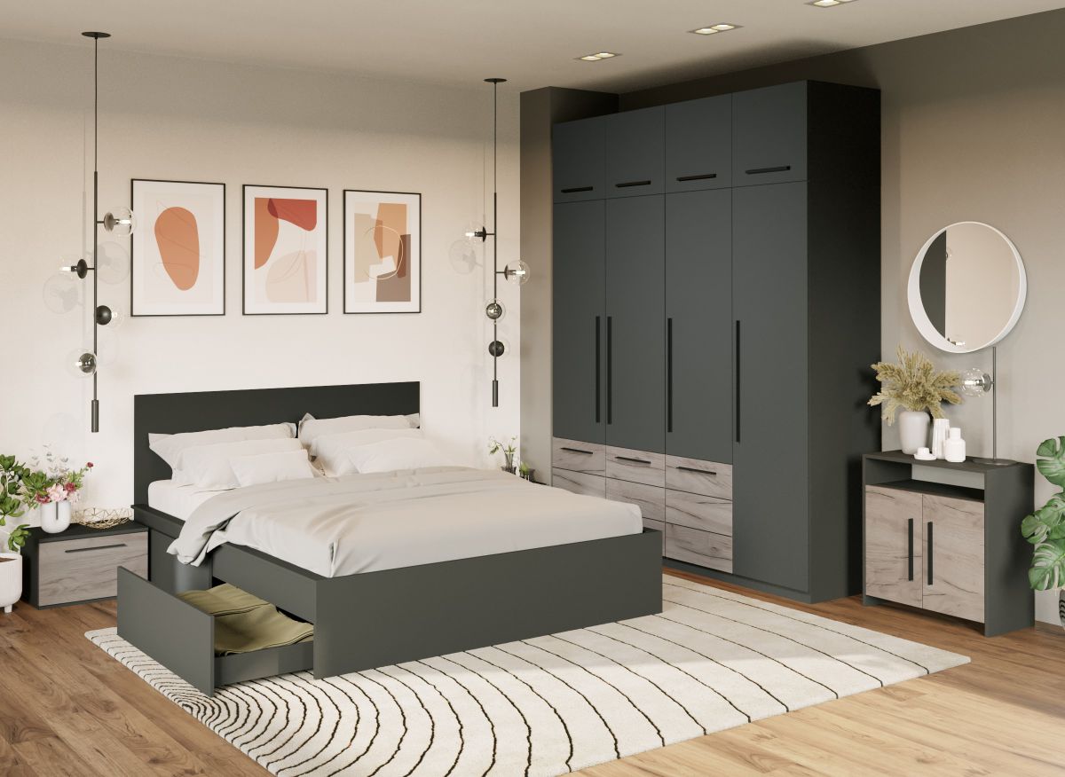 Dulap Inalt 2m Gri Noce Dulap Inalt 2m Gri Noce are 11 usi, iar interiorul este compartimentat cu 13 polite inchise si bara de umerase. Cu o inaltime de 2,48 metri , acest dulap este o solutie excelenta pentru a valorifica spatiul vertical, oferind mult spatiu de depozitare. Frezarile usilor de jos in combinatie cu decorul nature Stejar K02 dau un plus de stil. Finisajul gri antracit creeaza un ambient modern si atractiv. Este compus din: Dulap 1.51m – L 151 x A 53 x H 199cm – Schita Montaj Dulap 0.51m – L 51 x A 53 x H 199cm – Schita Montaj Dulap suprapozabil 3U – L 151 x A 53 x H 49.2 cm – Schita Montaj Dulap suprapozabil 1U – L 51 x A 53 x H 49.2 cm – Schita Montaj Dimensiuni Dulap Inalt 2m Gri Lungime: 202 cm Adancime: 53 cm Inaltime: 248.2 cm Livrare rapida prin flota proprie Suntem producatori de mobilier Toate corpurile au o garantie de 2 ani Video de prezentare familie Videoul de prezentare poate contine mai multe corpuri de mobilier sau mai putine in comparatie cu produsul de pe aceasta pagina. Scopul acestui video este de a detalia aspectul materialelor, accesoriilor cat si a familiei din care face parte. Dulap Inalt 2m Gri Noce Dulap Inalt 2m Gri Noce face parte din familia de mobila pentru dormitor Noce . Mobileaza un dormitor rapid si usor. Are tot ce ii trebuie: noptiere, comoda, dulapuri de haine si pat tapitat sau netapitat. O solutie ideala pentru un dormitor matrimonial. Concepute pentru a optimiza spatiul, dulapurile se potrivesc atat camerelor joase sau mansardelor, cat si celor inalte. Un alt plus al acestui dormitor este dat de patul cu pana la 4 sertare pentru depozitare si tapiteria din piele pentru confort sporit. Acestea sunt construite din PAL Kronospan melaminat cu finisaj Gri Antracit si Stejar K02, o textura similara lemnului, care creeaza un contrast rafinat si un ambient placut. Cantul aplicat este unul de 0,6 ce le permite muchiilor sa fie placute la atingere fiind finisate si atent retusate. Pretul afisat nu include alte accesorii sau obiecte de decor (tablouri, elemente de iluminat, asternuturi, covor etc.) Produsul se livreaza demontat si este insotit de accesorii si instructiuni de asamblare. Dimensiunile sunt exprimate in cm si pot oscila intre ± 10 mm.
