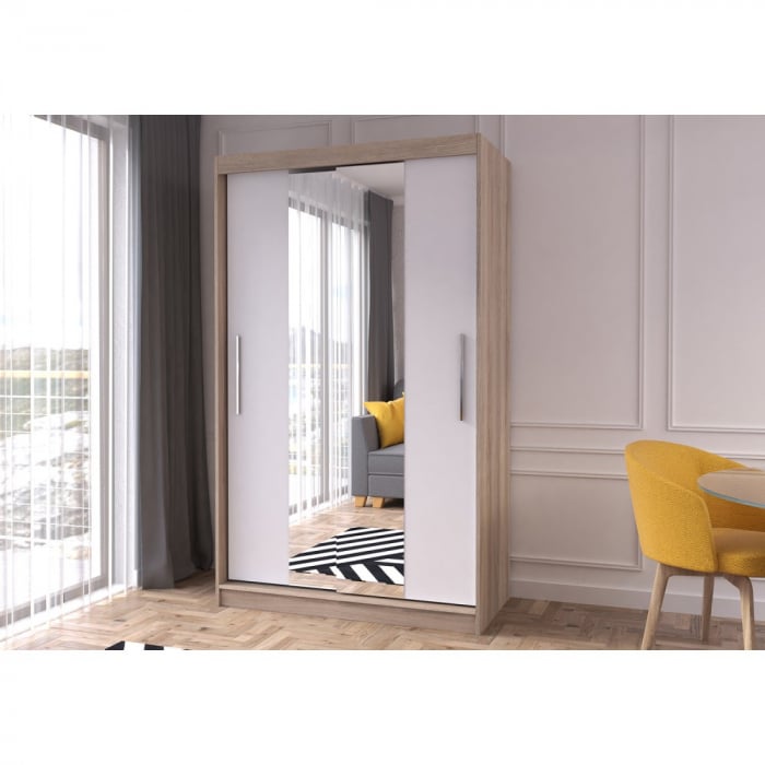 Dulap NEOMI 01, usi glisante, oglinda, 6 rafturi, bara de haine, corp sonoma, front alb, 120x61x200 cm