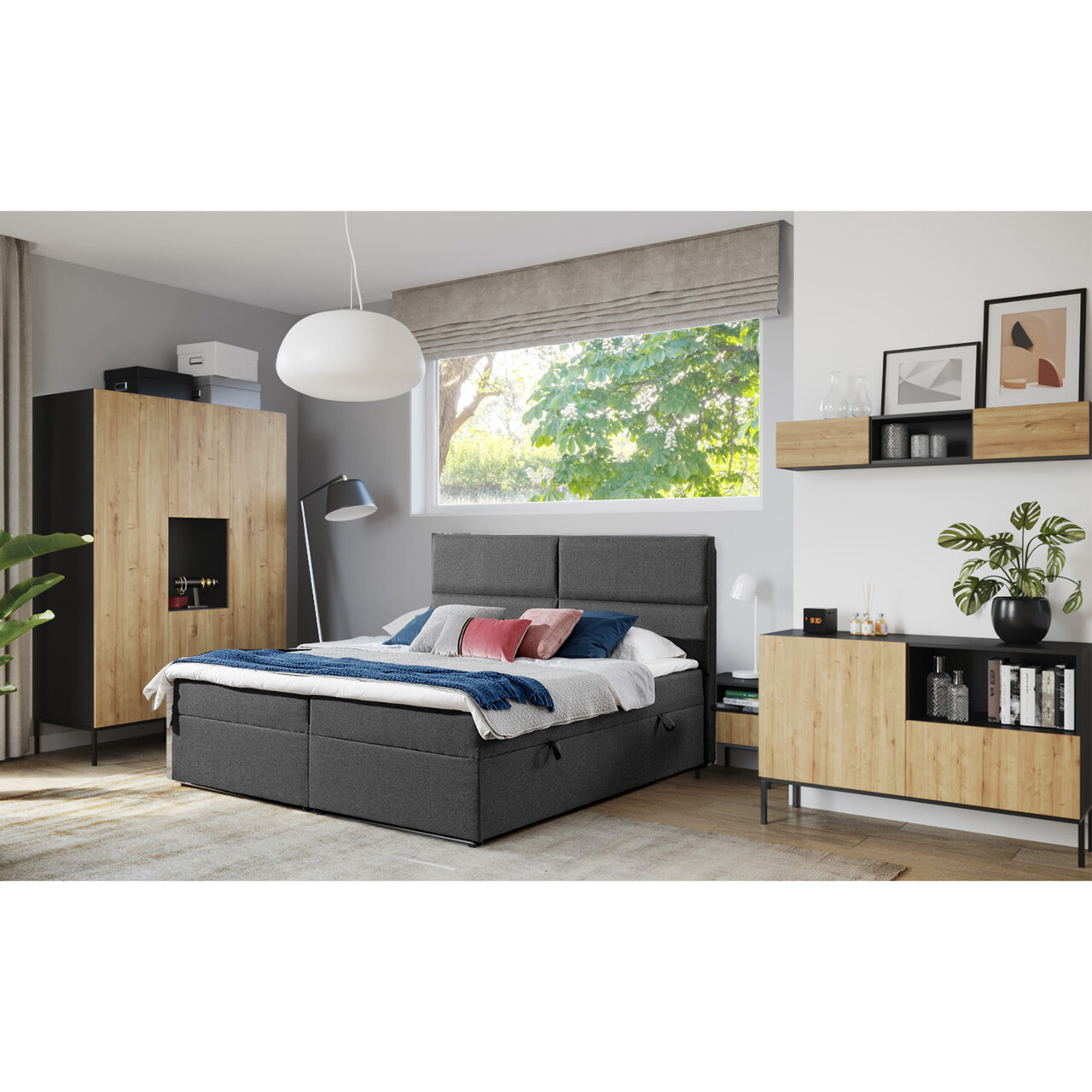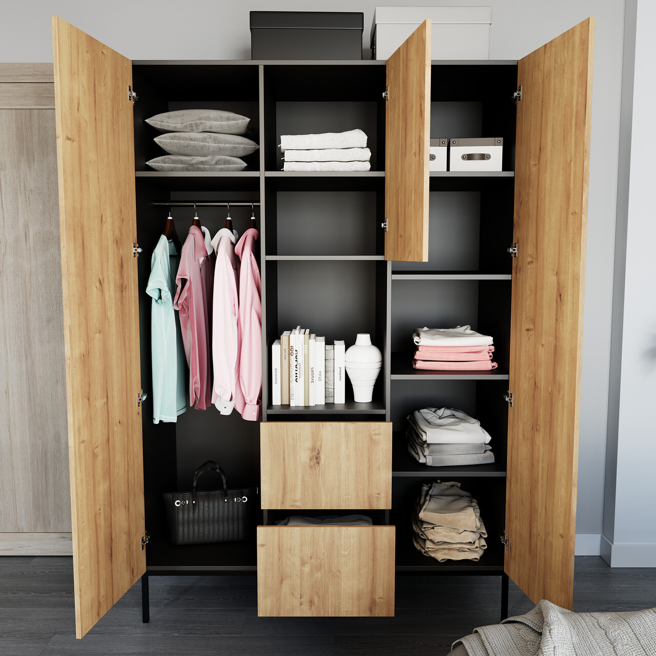 Dulapul de haine Lanzzi imbina designul rafinat, practicitatea si functionalitatea, oferind un spatiu generos pentru depozitare. Acesta este inteligent compartimentat in trei zone distincte. Prima zona include un loc cu sina pentru umerase, iar deasupra se afla un raft destinat plierii articolelor de imbracaminte. Partea centrala gazduieste o nisa ideala pentru obiecte decorative, iar deasupra acesteia sunt rafturi suplimentare pentru haine. Sub nisa sunt doua sertare spatioase care adauga un plus de organizare si confort. In partea dreapta, dulapul dispune de un compartiment cu o usa, echipat cu cinci rafturi, perfecte pentru depozitarea incaltamintei, palariilor, camasilor si a altor haine pliabile. Un element de design remarcabil al dulapului Lanzzi sunt picioarele metalice negre, care ridica mobilierul la 20 de centimetri deasupra solului, conferindu-i un aspect aerisit si modern. Fabricat din MDF laminat gros si rigid, acest dulap este disponibil in doua variante de culoare: o combinatie eleganta de negru cu stejar sau exclusiv negru, cu manere aurii pentru un plus de rafinament. Informatii suplimentarePicioare din metal de culoare neagra.Inaltime picioare: 20 cmProdusul necesita asamblare.