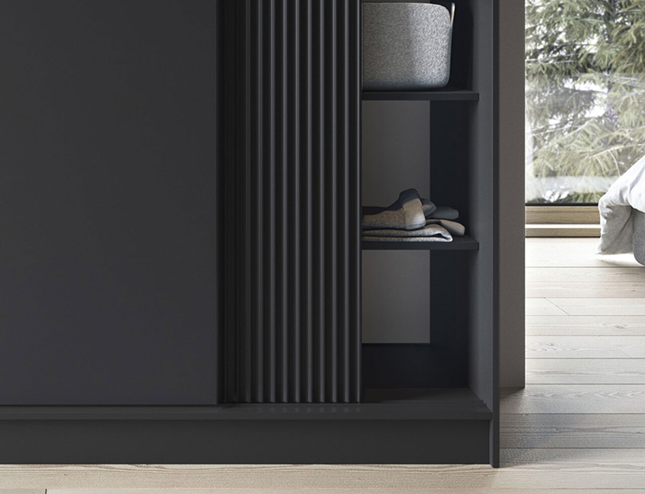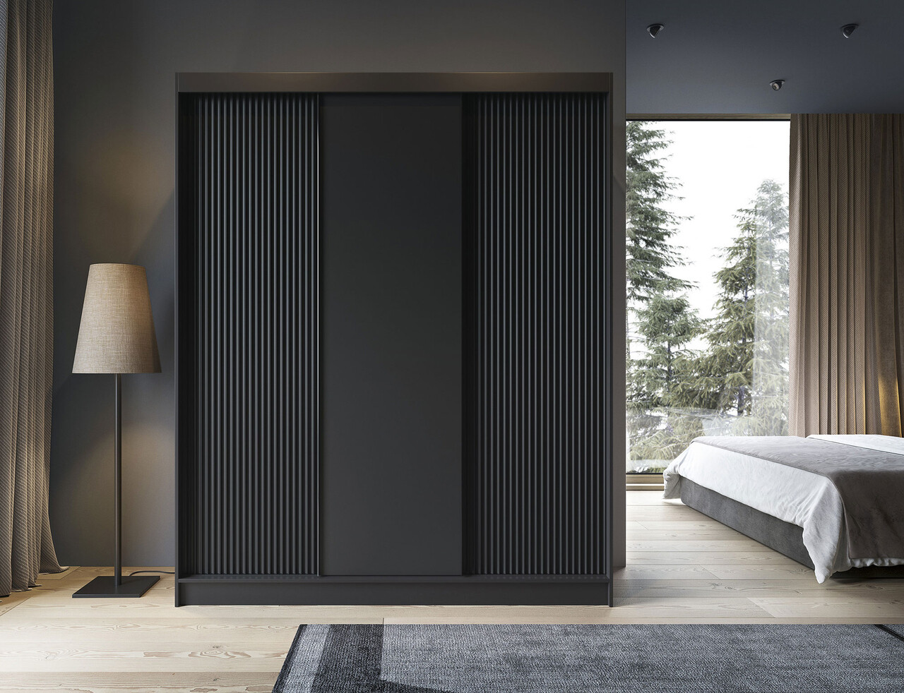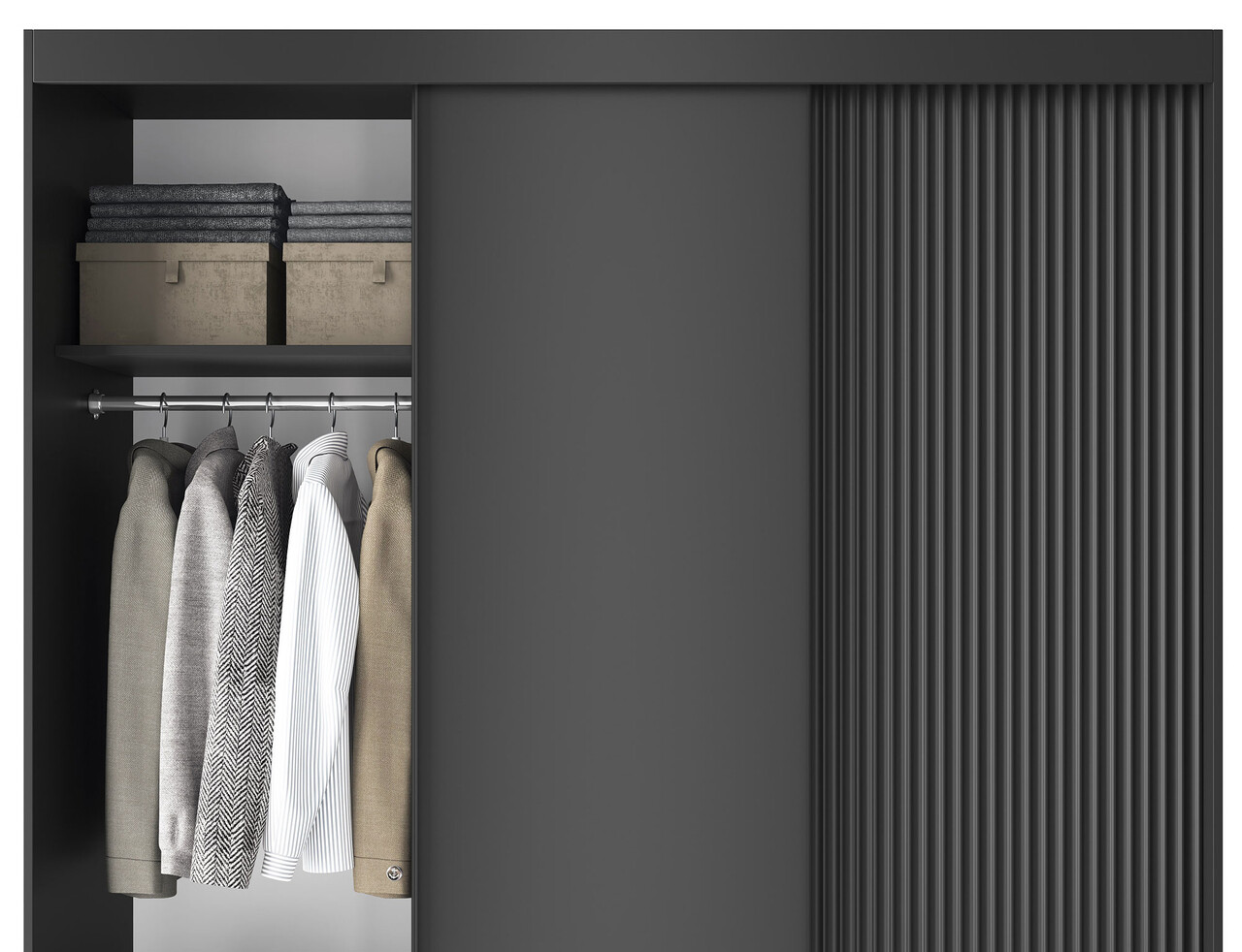 Dulapul pentru haine Prescco este o solutie practica si eleganta de depozitare care optimizeaza eficient spatiul din interiorul dormitorului tau. Acest dulap functional a fost proiectat cu atentie pentru a va satisface nevoile organizationale, mentinand in acelasi timp un aspect modern. Designul dulapului se bazeaza pe materiale de inalta calitate. Corpul dulapului este realizat din placa MDF durabila de 16 mm grosime care garanteaza stabilitate si robustete. Marginea ABS de pe marginile corpului protejeaza suplimentar dulapul de eventualele deteriorari, mentinand aspectul sau estetic. Culoarea neagra a dulapului ii confera un caracter modern care se potriveste perfect cu diferite stiluri de design interior. Prevazut cu 3 usi glisante care permit accesul usor la interiorul dulapului si, in acelasi timp, economisesc spatiu in camera. Dulapul include sase rafturi, fiecare dintre ele putand suporta maximum 10 kg de incarcatura. Este o solutie practica pentru depozitarea imbracamintei, accesoriilor si a altor obiecte mici. In plus, tijele incluse va permit sa va atarnati hainele confortabil, ceea ce va ajuta sa pastrati lucrurile organizate si ingrijite. Picioarele inalte de 0.5 cm realizate din plastic durabil in negru si glisiera in aceeasi culoare asigura stabilitate si permit mutarea cu usurinta a dulapului.