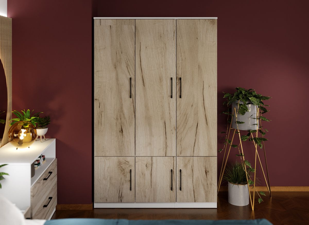 Dulap Relax Alb / Stejar k02 – C124/04 Dulap cu un design echilibrat si linistitor pentru orice camera de dormitor. Dulap Relax Alb / Stejar k02 – C124/04 nu se rezuma doar la aspect, ci are si o utilitate desavarsita, avand compartimentare cu: 5 polite + bara de haine in partea de sus 2 polite in partea de jos Finisajul palului Stejar k02 creeaza un ambient modern si atractiv in combinatie cu manerele negre si carcasa de dulap alba. Are dimensiuni generoase, este spatios, iar inaltimea este conceputa cat sa incapa si in camere mai putin inalte sau in mansarde. SCHITA MONTAJ DULAP 41 SCHITA MONTAJ DULAP 83 CU USI Dimensiuni Dulap Relax Alb / Stejar k02 – C124/04 Latime: 124 cm Adancime: 48 cm Inaltime: 192.5 cm Livrare Gratuita prin flota proprie Preturi de producator Toate corpurile au o garantie de 2 ani Video de prezentare familie Videoul de prezentare poate contine mai multe corpuri de mobilier sau mai putine in comparatie cu produsul de pe aceasta pagina. Scopul acestui video este de a detalia aspectul materialelor, accesoriilor cat si a familiei din care face parte. Dulap Relax Alb / Stejar k02 – C124/04 Dulapul face parte din familia de mobila pentru dormitor Relax ce are un aspect modern combinand palul alb si stejar k02 cu manerele negre. Acesta are dimensiuni diverse si este proiectat pe 4 latimi . Variante mai inguste pentru camere mici si medii si variante extinse pentru camere mai mari. Pe langa dulapuri, comoda, noptierele si patul ofera la randul lor spatii de depozitare prin sertare . Deasemenea puteti alege seturi cu pat ce au spatarul tapitat sau simplu cu trei dimensiuni de 140, 160, 180×200. Aveti posibilitatea de a adauga doua sau patru lazi de depozitare. Acestea sunt construite din PAL melaminat cu finisaj Alb si Stejar k02 ce creeaza un ambient rafinat si un aspect placut. Cantul aplicat este unul de 0,6 ce le permite muchiilor sa fie placute la atingere fiind finisate si atent retusate. Pretul afisat nu include alte accesorii sau obiecte de decor (tablouri, elemente de iluminat, asternuturi, covor etc.) Produsul se livreaza demontat si este insotit de accesorii si instructiuni de asamblare. Dimensiunile sunt exprimate in cm si pot oscila intre ± 10 mm.