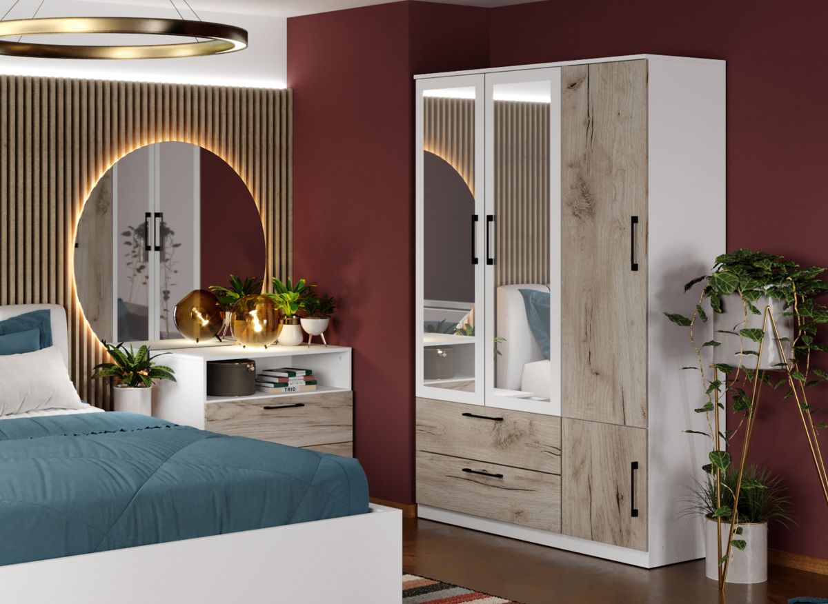 Dulap Relax Alb / Stejar k02 – C124/05 cu oglinda Dulap cu un design echilibrat si linistitor pentru orice camera de dormitor. Dulap Relax Alb / Stejar k02 – C124/05 cu oglinda nu se rezuma doar la aspect, ci are si o utilitate desavarsita, avand compartimentare cu: 5 polite + bara de haine in partea de sus 2 sertare + o polita in partea de jos ( nu sunt prezentate sertarele in randarea de compartimentare dulap, insa sertarele sunt incluse ) Finisajul palului Alb si Stejar k02 creeaza un ambient modern si atractiv in combinatie cu manerele negre si carcasa de dulap alba. Oglinda, pe langa utilitatea sa de baza, da senzatia de camera marita si spatioasa. Are dimensiuni generoase, este spatios, iar inaltimea este conceputa cat sa incapa si in camere mai putin inalte sau in mansarde. SCHITA MONTAJ DULAP 41 SCHITA MONTAJ DULAP 83 CU SERTARE Dimensiuni Dulap Relax Alb / Stejar k02 – C124/05 cu oglinda Latime: 124 cm Adancime: 48 cm Inaltime: 192.5 cm Livrare Gratuita prin flota proprie Preturi de producator Toate corpurile au o garantie de 2 ani Video de prezentare familie Videoul de prezentare poate contine mai multe corpuri de mobilier sau mai putine in comparatie cu produsul de pe aceasta pagina. Scopul acestui video este de a detalia aspectul materialelor, accesoriilor cat si a familiei din care face parte. Dulap Relax Alb / Stejar k02 – C124/05 cu oglinda Dulapul face parte din familia de mobila pentru dormitor Relax ce are un aspect modern combinand palul alb si stejar k02 cu manerele negre. Acesta are dimensiuni diverse si este proiectat pe 4 latimi . Variante mai inguste pentru camere mici si medii si variante extinse pentru camere mai mari. Pe langa dulapuri, comoda, noptierele si patul ofera la randul lor spatii de depozitare prin sertare . Deasemenea puteti alege seturi cu pat ce au spatarul tapitat sau simplu cu trei dimensiuni de 140, 160, 180×200. Aveti posibilitatea de a adauga doua sau patru lazi de depozitare. Acestea sunt construite din PAL melaminat cu finisaj Alb si Stejar k02 ce creeaza un ambient rafinat si un aspect placut. Cantul aplicat este unul de 0,6 ce le permite muchiilor sa fie placute la atingere fiind finisate si atent retusate. Pretul afisat nu include alte accesorii sau obiecte de decor (tablouri, elemente de iluminat, asternuturi, covor etc.) Produsul se livreaza demontat si este insotit de accesorii si instructiuni de asamblare. Dimensiunile sunt exprimate in cm si pot oscila intre ± 10 mm.