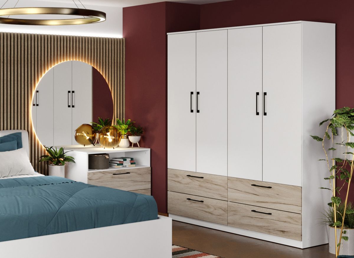 Dulap Relax Alb / Stejar k02 – C164/01 Dulap cu un design echilibrat si linistitor pentru orice camera de dormitor. Dulap Relax Alb / Stejar k02 – C164/01 nu se rezuma doar la aspect, ci are si o utilitate desavarsita, avand compartimentare cu: 4 polite + bara de haine in partea de sus 4 sertare in partea de jos ( nu sunt prezentate sertarele in randarea de compartimentare dulap, insa sertarele sunt incluse ) Finisajul palului Alb si Stejar k02 creeaza un ambient modern si atractiv in combinatie cu manerele negre si carcasa de dulap alba. Are dimensiuni generoase, este spatios, iar inaltimea este conceputa cat sa incapa si in camere mai putin inalte sau in mansarde. SCHITA MONTAJ DULAP 164 CU SERTARE Dimensiuni Dulap Relax Alb / Stejar k02 – C164/01 Latime: 164.4 cm Adancime: 48 cm Inaltime: 192.5 cm Livrare Gratuita prin flota proprie Preturi de producator Toate corpurile au o garantie de 2 ani Video de prezentare familie Videoul de prezentare poate contine mai multe corpuri de mobilier sau mai putine in comparatie cu produsul de pe aceasta pagina. Scopul acestui video este de a detalia aspectul materialelor, accesoriilor cat si a familiei din care face parte. Dulap Relax Alb / Stejar k02 – C164/01 Dulapul face parte din familia de mobila pentru dormitor Relax ce are un aspect modern combinand palul alb si stejar k02 cu manerele negre. Acesta are dimensiuni diverse si este proiectat pe 4 latimi . Variante mai inguste pentru camere mici si medii si variante extinse pentru camere mai mari. Pe langa dulapuri, comoda, noptierele si patul ofera la randul lor spatii de depozitare prin sertare . Deasemenea puteti alege seturi cu pat ce au spatarul tapitat sau simplu cu trei dimensiuni de 140, 160, 180×200. Aveti posibilitatea de a adauga doua sau patru lazi de depozitare. Acestea sunt construite din PAL melaminat cu finisaj Alb si Stejar k02 ce creeaza un ambient rafinat si un aspect placut. Cantul aplicat este unul de 0,6 ce le permite muchiilor sa fie placute la atingere fiind finisate si atent retusate. Pretul afisat nu include alte accesorii sau obiecte de decor (tablouri, elemente de iluminat, asternuturi, covor etc.) Produsul se livreaza demontat si este insotit de accesorii si instructiuni de asamblare. Dimensiunile sunt exprimate in cm si pot oscila intre ± 10 mm.