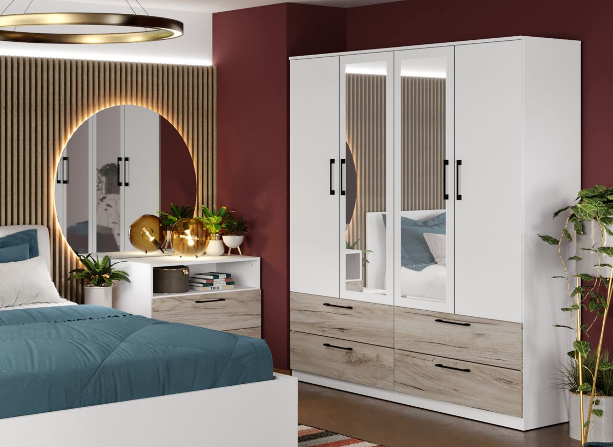 Dulap Relax Alb / Stejar k02 – C164/05 cu oglinda Dulap cu un design echilibrat si linistitor pentru orice camera de dormitor. Dulap Relax Alb / Stejar k02 – C164/05 cu oglinda nu se rezuma doar la aspect, ci are si o utilitate desavarsita, avand compartimentare cu: 4 polite + bara de haine in partea de sus 4 sertare in partea de jos ( nu sunt prezentate sertarele in randarea de compartimentare dulap, insa sertarele sunt incluse ) Finisajul palului Alb si Stejar k02 creeaza un ambient modern si atractiv in combinatie cu manerele negre si carcasa de dulap alba. Oglinda, pe langa utilitatea sa de baza, da senzatia de camera marita si spatioasa. Are dimensiuni generoase, este spatios, iar inaltimea este conceputa cat sa incapa si in camere mai putin inalte sau in mansarde. SCHITA MONTAJ DULAP 164 CU SERTARE Dimensiuni Dulap Relax Alb / Stejar k02 – C164/05 cu oglinda Latime: 164.4 cm Adancime: 48 cm Inaltime: 192.5 cm Livrare Gratuita prin flota proprie Preturi de producator Toate corpurile au o garantie de 2 ani Video de prezentare familie Videoul de prezentare poate contine mai multe corpuri de mobilier sau mai putine in comparatie cu produsul de pe aceasta pagina. Scopul acestui video este de a detalia aspectul materialelor, accesoriilor cat si a familiei din care face parte. Dulap Relax Alb / Stejar k02 – C164/05 cu oglinda Dulapul face parte din familia de mobila pentru dormitor Relax ce are un aspect modern combinand palul alb si stejar k02 cu manerele negre. Acesta are dimensiuni diverse si este proiectat pe 4 latimi . Variante mai inguste pentru camere mici si medii si variante extinse pentru camere mai mari. Pe langa dulapuri, comoda, noptierele si patul ofera la randul lor spatii de depozitare prin sertare . Deasemenea puteti alege seturi cu pat ce au spatarul tapitat sau simplu cu trei dimensiuni de 140, 160, 180×200. Aveti posibilitatea de a adauga doua sau patru lazi de depozitare. Acestea sunt construite din PAL melaminat cu finisaj Alb si Stejar k02 ce creeaza un ambient rafinat si un aspect placut. Cantul aplicat este unul de 0,6 ce le permite muchiilor sa fie placute la atingere fiind finisate si atent retusate. Pretul afisat nu include alte accesorii sau obiecte de decor (tablouri, elemente de iluminat, asternuturi, covor etc.) Produsul se livreaza demontat si este insotit de accesorii si instructiuni de asamblare. Dimensiunile sunt exprimate in cm si pot oscila intre ± 10 mm.