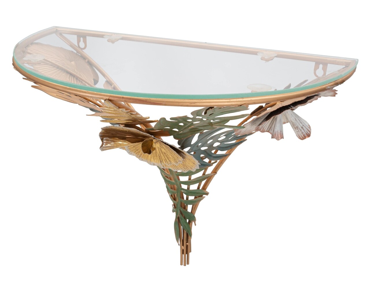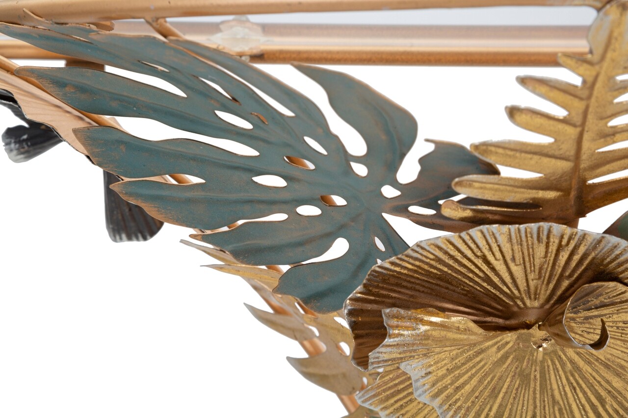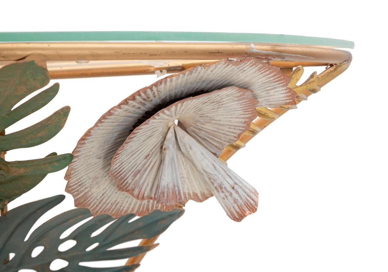 Masuta noptiera semicirculara montata pe perete din metal auriu cu blat de sticla. Baza este bogat decorata cu frunze si flori in diverse culori. Designul deosebit confera o nota de clasa si relaxare oricarei camere.Compozitie material: fier, sticla