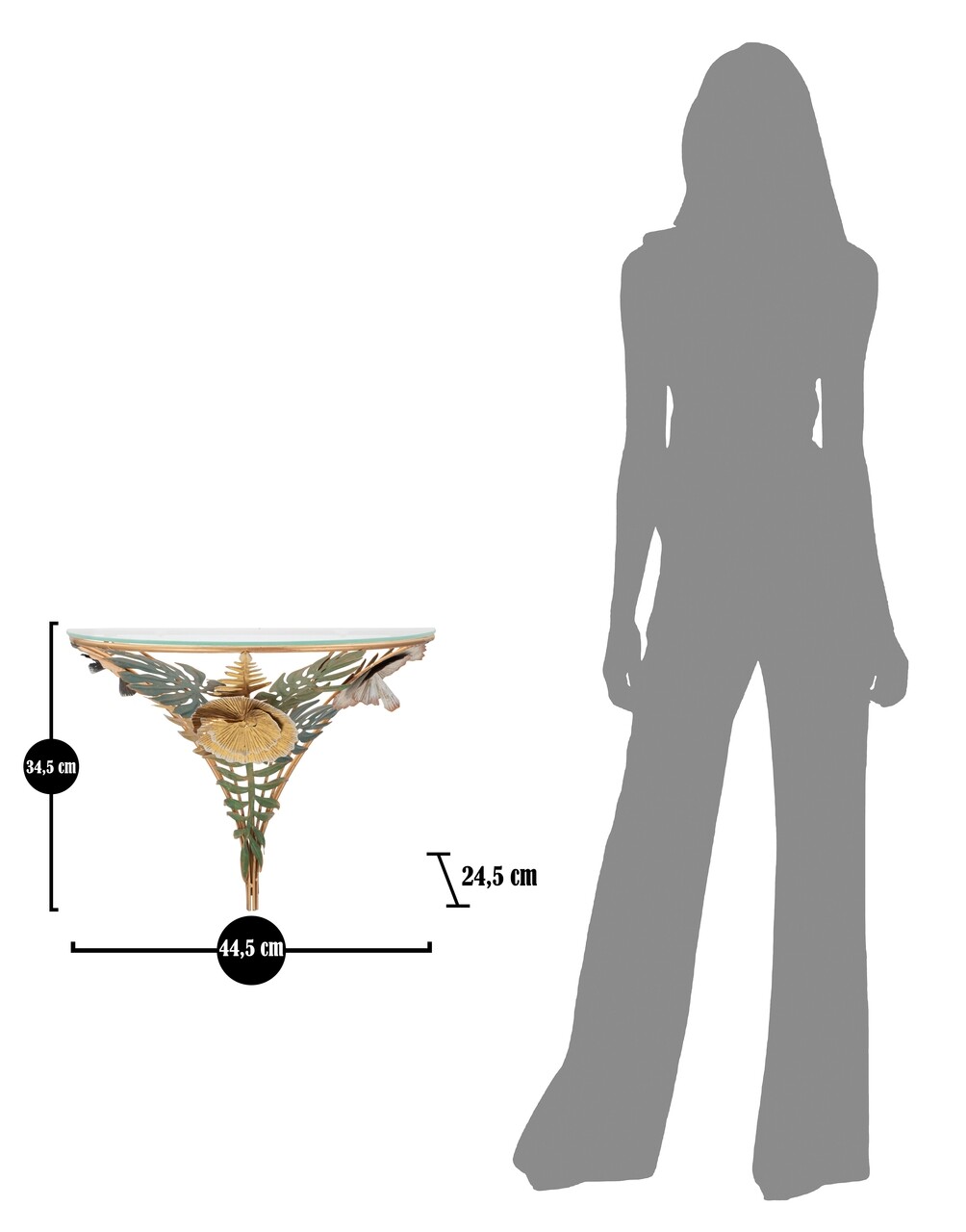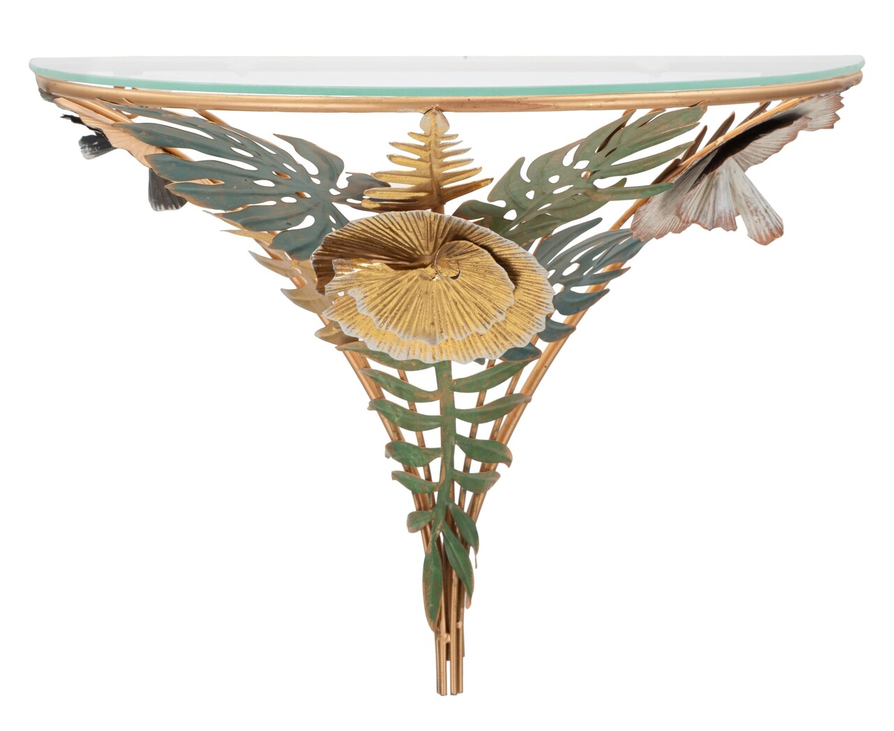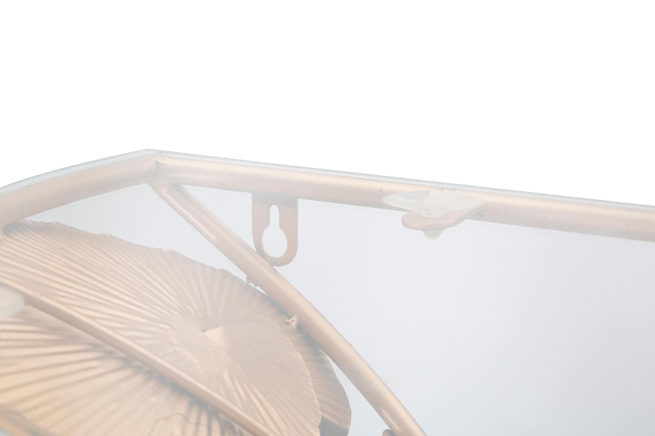 Masuta noptiera semicirculara montata pe perete din metal auriu cu blat de sticla. Baza este bogat decorata cu frunze si flori in diverse culori. Designul deosebit confera o nota de clasa si relaxare oricarei camere.Compozitie material: fier, sticla