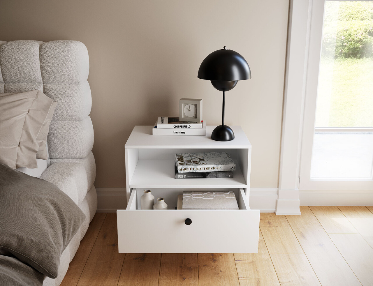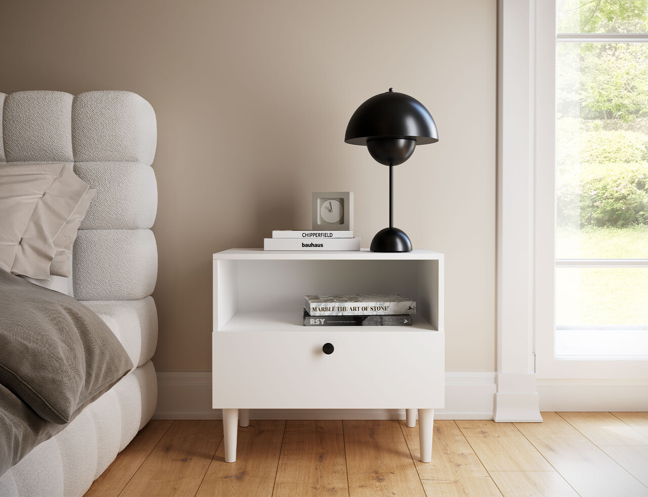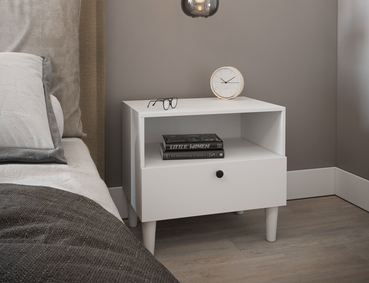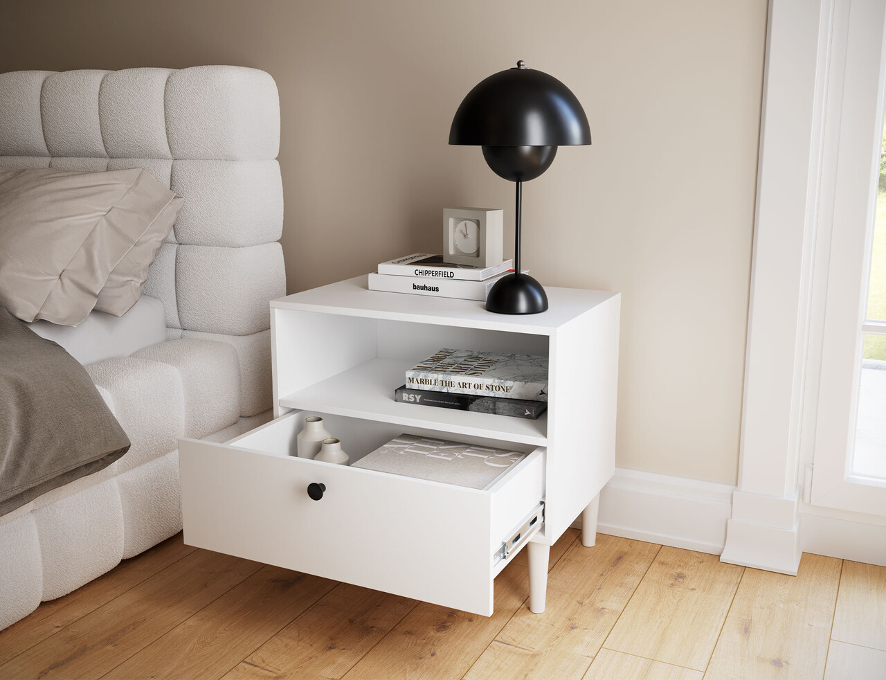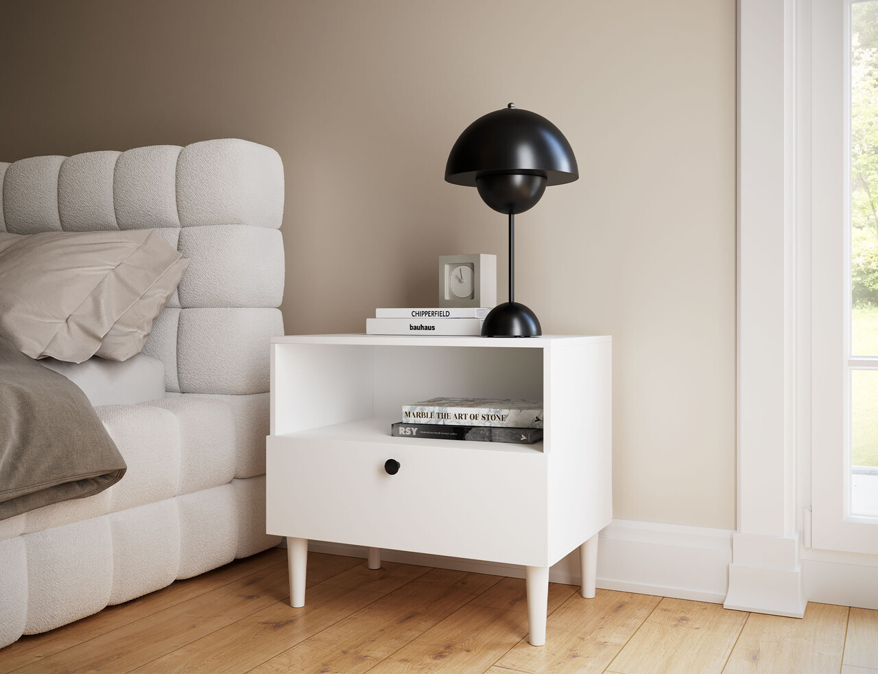 Noptiera Dullum este un mobilier functional si stilat. Este echipata cu un raft deschis si un sertar, oferind un loc practic pentru depozitarea obiectelor necesare. Designul sau elegant face ca noptiera sa se integreze perfect in orice interior, aducandu-i un caracter modern. Dispune de picioare inalte de 15 cm.