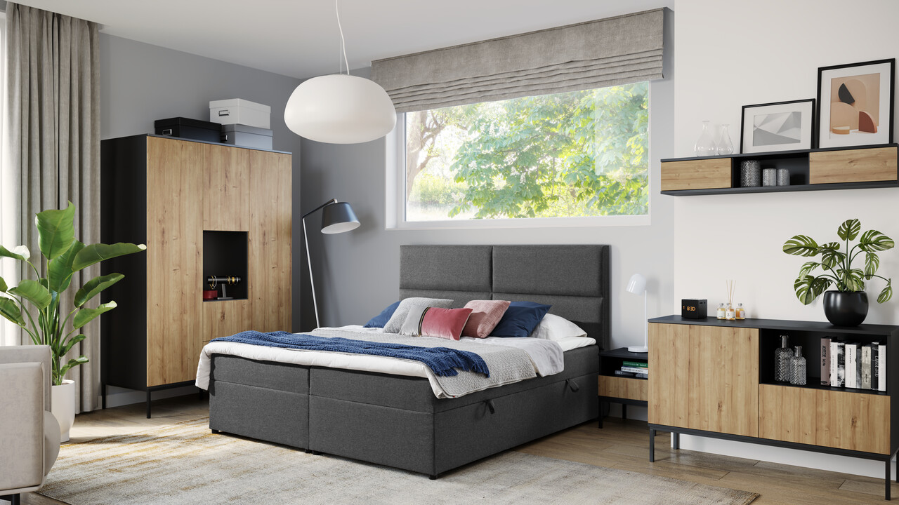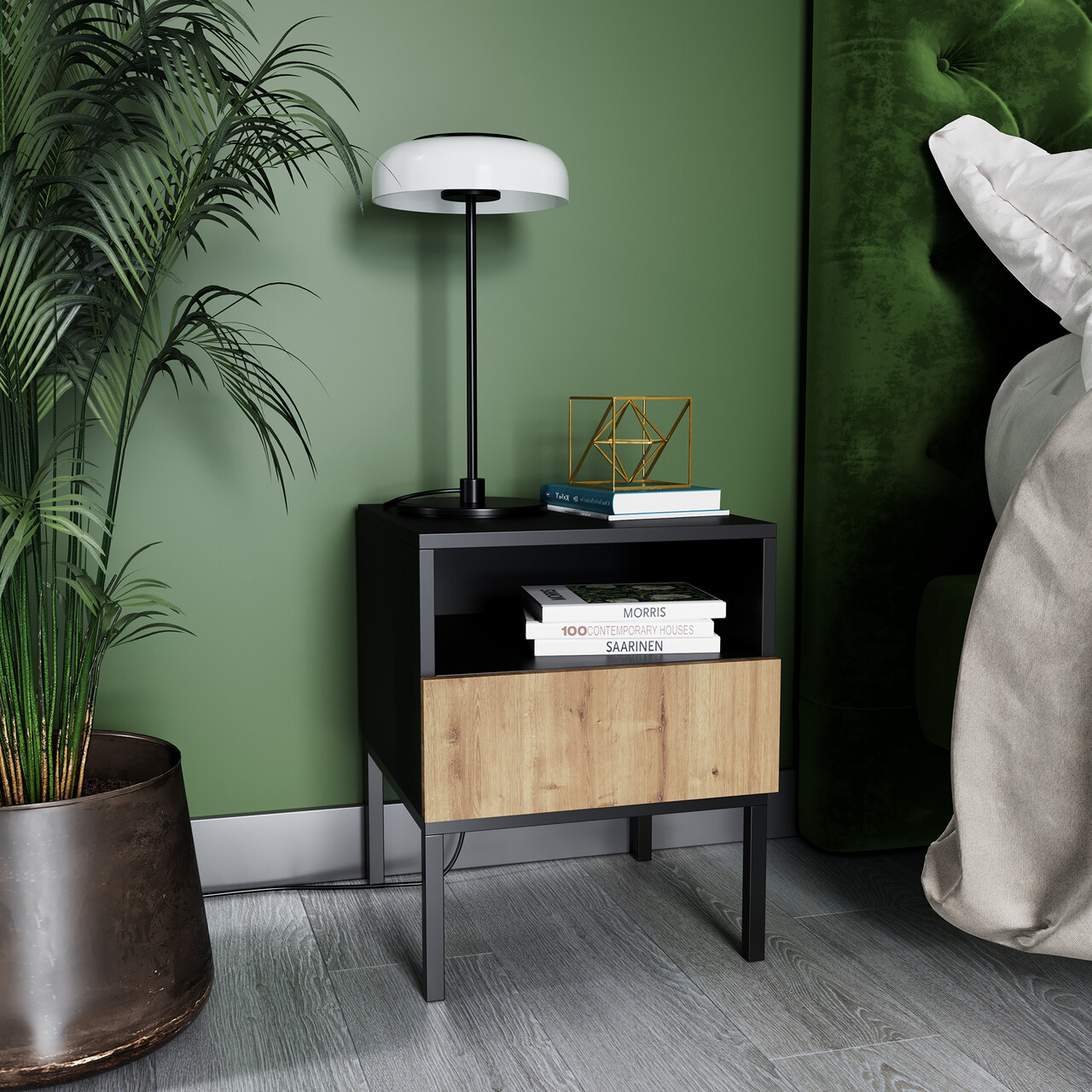 Noptiera Lanzzi reprezinta o alegere excelenta, potrivita atat pentru un pat jos, cat si pentru unul inalt, gratie designului sau cald si modest, dar si functionalitatii deosebite, oferind spatiu generos pentru depozitarea obiectelor esentiale. Construita din MDF laminat de inalta calitate, aceasta combina eleganta metalului si detaliile subtile ale picioarelor negre, de 20 cm inaltime, oferind un aspect rafinat. Compartimentele de depozitare includ un sertar montat pe glisiere silentioase si o raft suplimentara pentru organizare optima. Sertarul dispune de un mecanism de inchidere moale, pentru un confort sporit la utilizare. Disponibila in doua variante de culoare, noptiera Lanzzi poate fi aleasa intr-o combinatie eleganta de stejar si negru mat, cu sistem de deschidere „push to open”, sau intr-o varianta complet neagra, decorata cu un maner auriu care adauga un plus de rafinament. In ambele optiuni, stilul minimalist este pastrat cu grija, transformand-o intr-o piesa de mobilier compacta, dar extrem de practica si estetica. Informatii suplimentarePicioare din metal de culoare neagra.Inaltime picioare: 20 cmProdusul necesita asamblare.