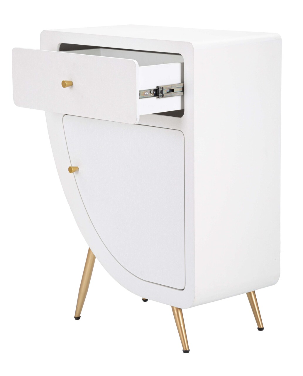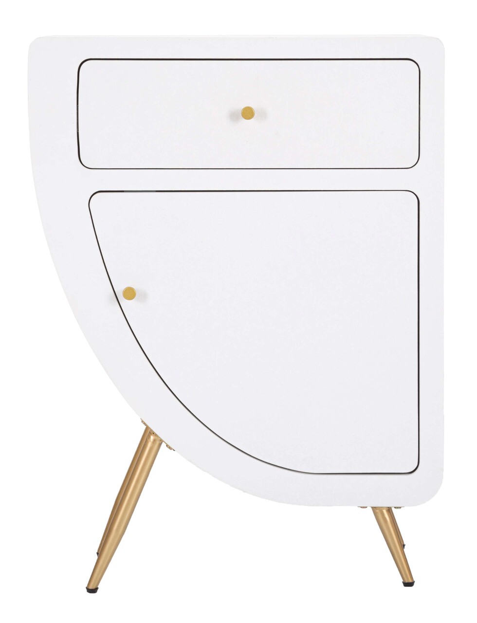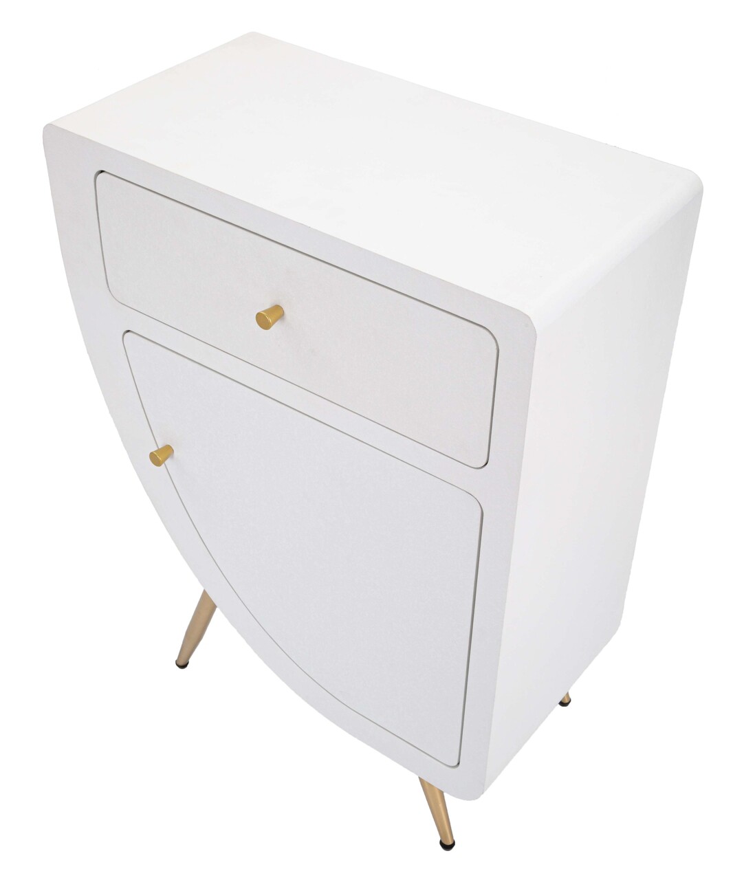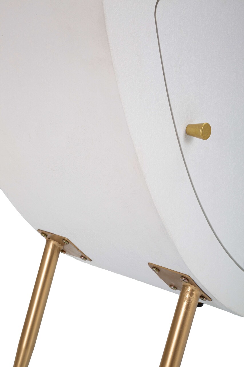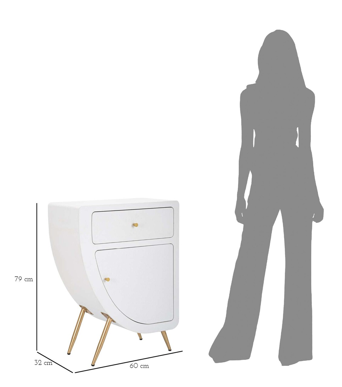 Noptiera din lemn alb, cu design curbat inspirat de estetica anilor ’70.Include un sertar si o usa pentru depozitare eficienta. Picioare din metal auriu, se monteaza cu usurinta.Compozitie material: MDF, fier.Dimensini interioare sertar: 44.5x27x11 cm.Dimensiuni compartiment cu usa: 44x31x42 cm.