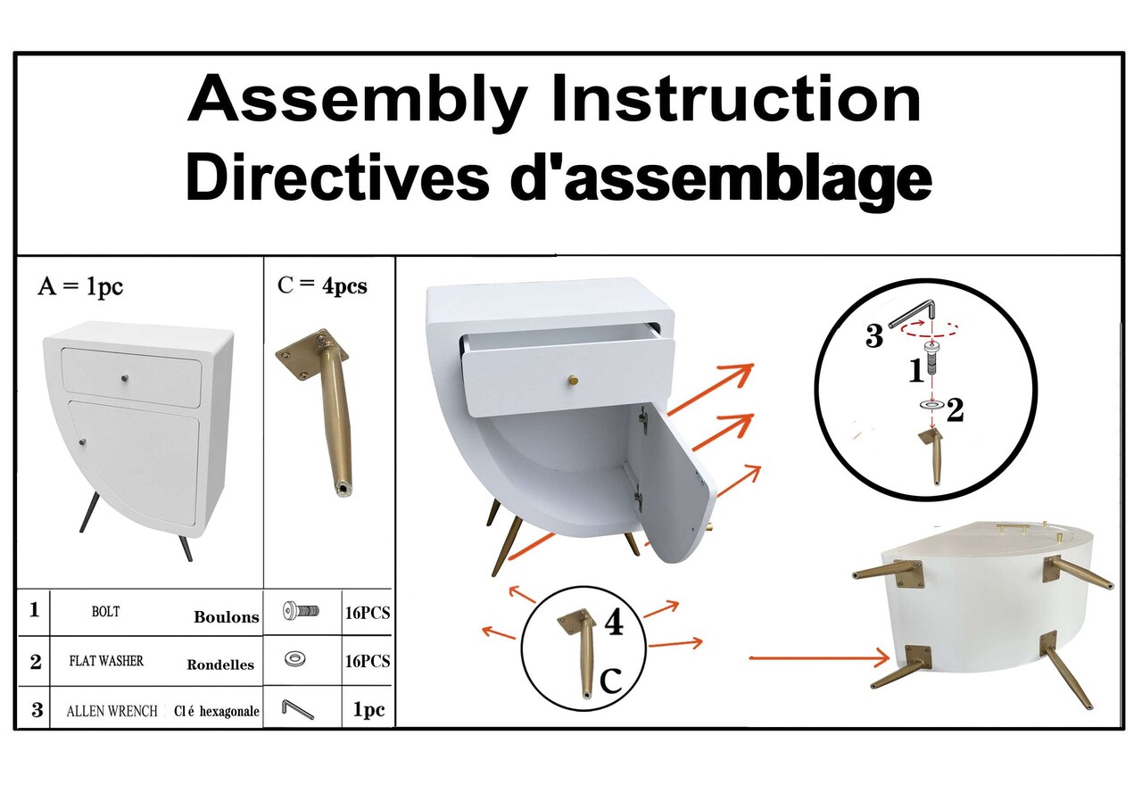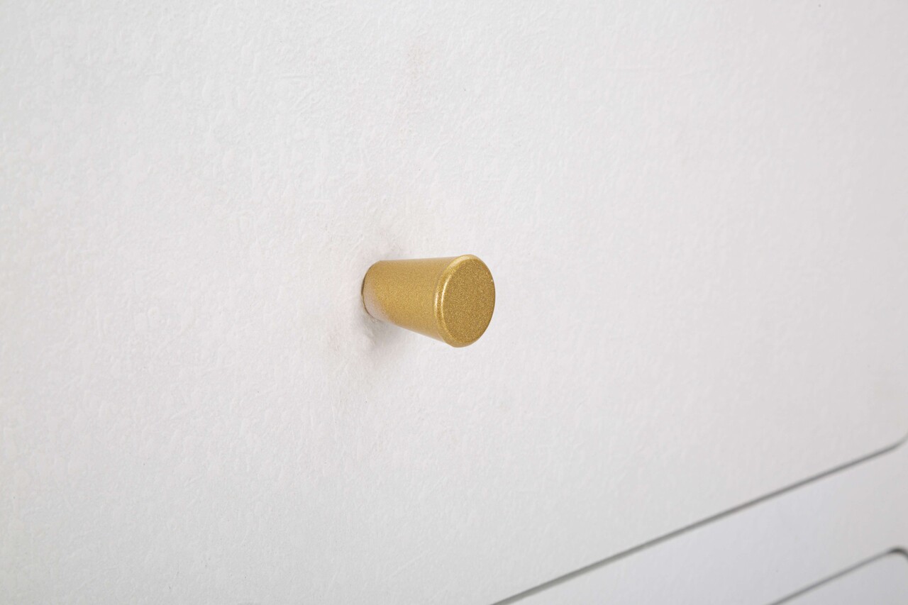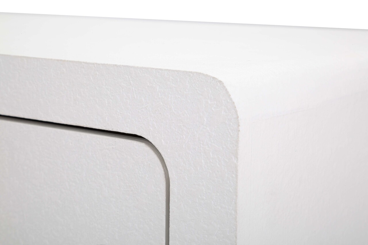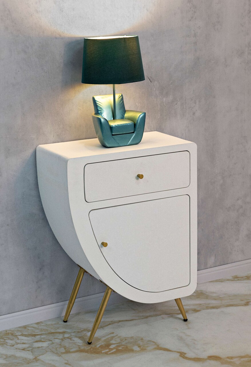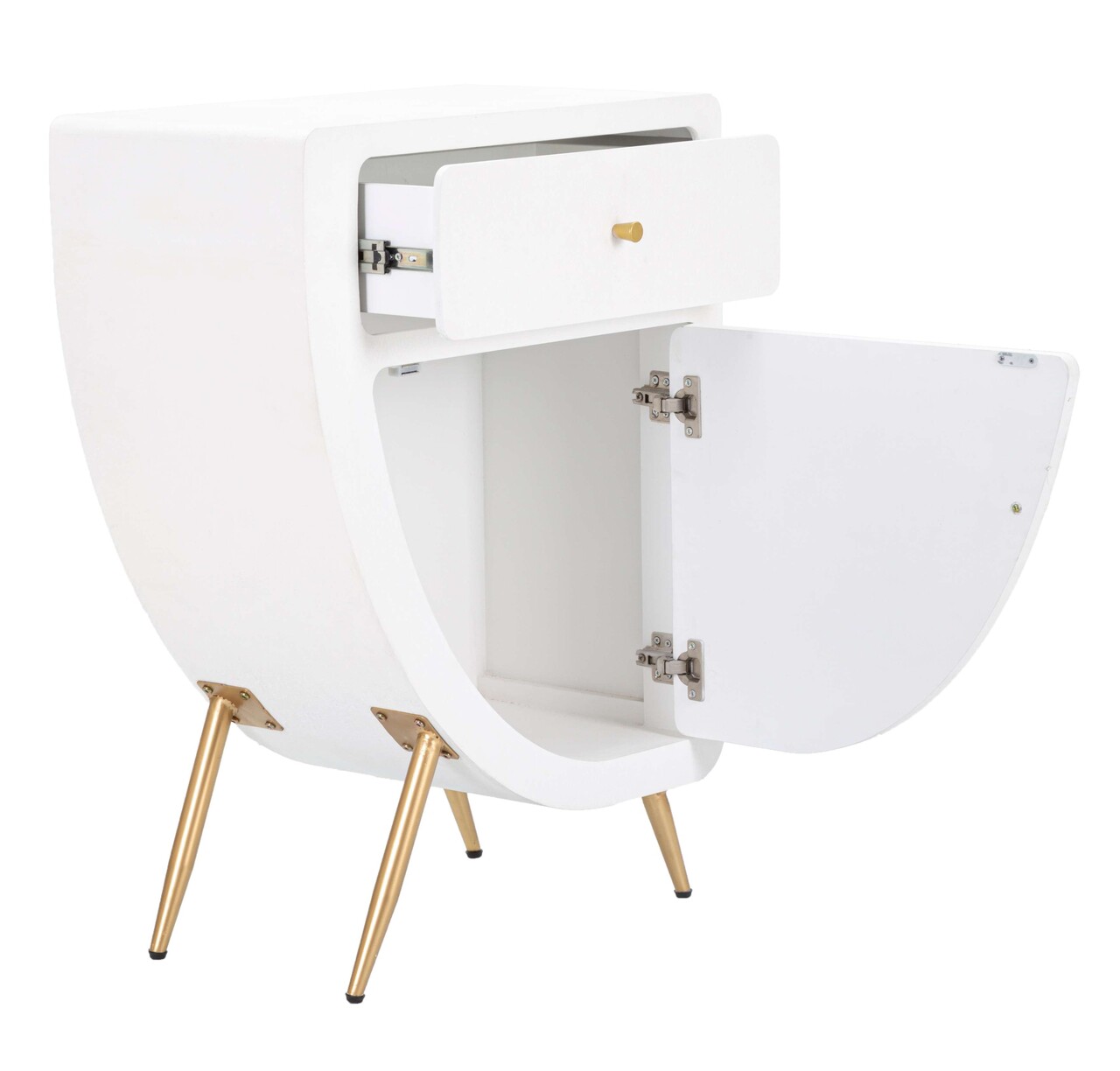 Noptiera din lemn alb, cu design curbat inspirat de estetica anilor ’70.Include un sertar si o usa pentru depozitare eficienta. Picioare din metal auriu, se monteaza cu usurinta.Compozitie material: MDF, fier.Dimensini interioare sertar: 44.5x27x11 cm.Dimensiuni compartiment cu usa: 44x31x42 cm.