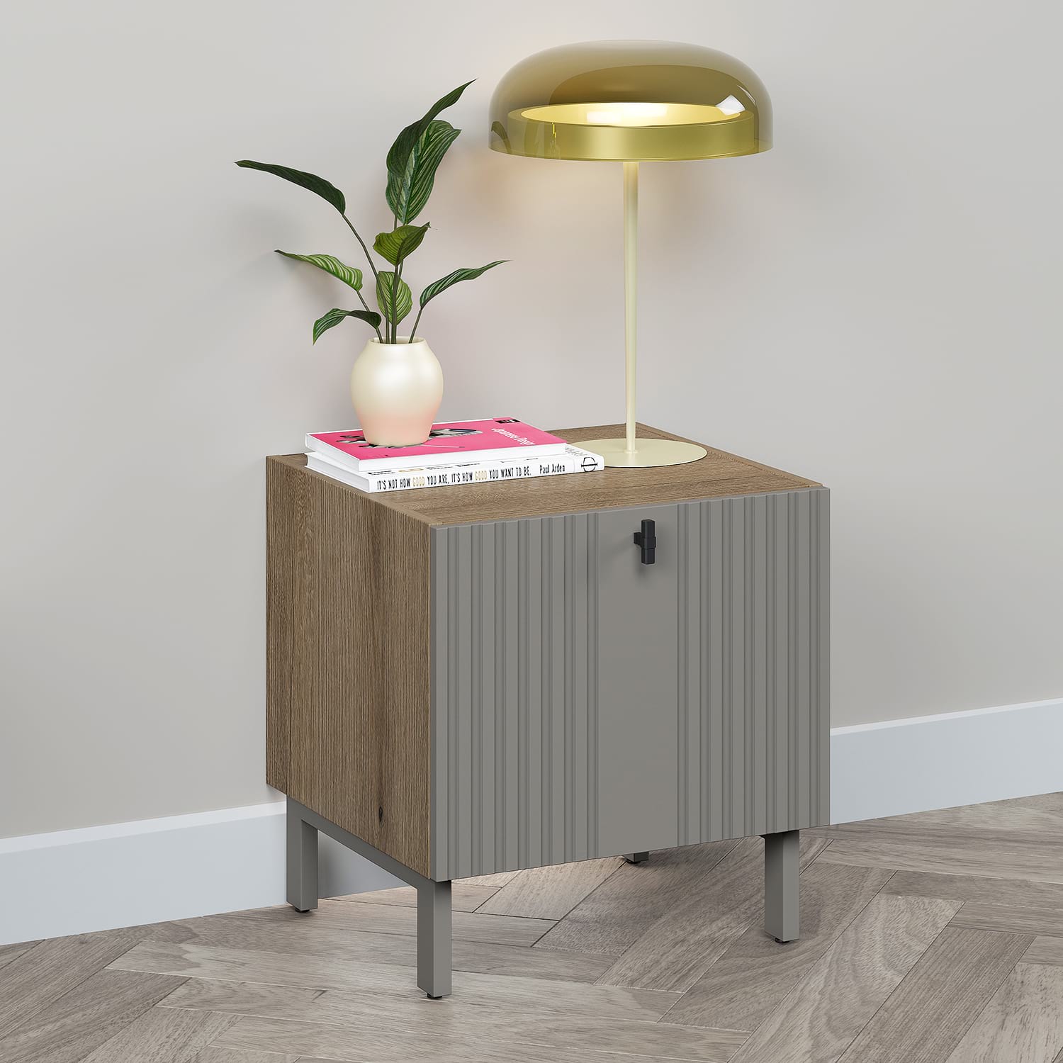 Exclusiv TAMOS! Fabricat in ROMANIA!Noptiera moderna cu front MDF riflat – personalizabila, funcționala si eleganta!Redefineste stilul dormitorului tau cu o piesa de mobilier ce imbina designul contemporan cu funcționalitatea si calitatea materialelor! Noptiera noastra cu usa din MDF frezata tip riflaj si finisaj vopsit gri piatra aduce o nota sofisticata in orice incapere. Caracteristici + Configurare flexibilaCarcasa solida din PAL de 16 mm – Durabila si stabila, in nuanțe neutre usor de integrat.Asamblare un sistem rastex/cama si cepi de lemnPFL inserat in nut pentru un plus de rezistențaUsa cu deschidere tip sustinere (tip bar) mecanism Hafele Duo standard – Acces facil si confort zilnic.Picioare metalice cu reglaj de inalțime (13-14 cm) – Stabilitate pe orice suprafața, design elegant, culoare la alegere.Butoni metalici Made in Italy – Detaliu sofisticat, nu plastic!Configurație flexibila:– Culoare fronturi, butoni si picioare la alegere – Opțiune suspendare pe perete – Opțional: iluminare LED ambientala pentru un efect wow! Dimensiunilungime: 45cmlatime: 42cminaltime (fara picioare): 35cminaltime (cu picioare reglabile): 48 – 50cm MaterialeCarcasa – PAL Stejar 16mmUsa – MDF 16mm frezat tip riflaj R1, vopsit mat Gri PiatraDe ce sa alegi aceasta noptiera?Design personalizabil: Se potriveste perfect stilului tau – alege nuanțele care completeaza decorul dormitorului.Materiale premium: Detaliile fac diferența – de la fronturile riflate la butonii metalici.Funcționalitate maxima: Sertarele spațioase cu soft-close, picioarele reglabile si opțiunea de suspendare o fac potrivita pentru orice nevoie.Montaj usor si livrare rapida. Garantie producator 24 luni Livrare GRATUITA in toata Romania…