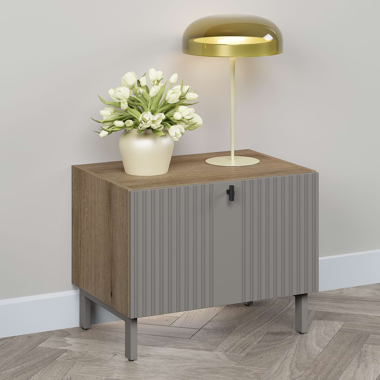 Exclusiv TAMOS! Fabricat in ROMANIA!Noptiera moderna cu front MDF riflat – personalizabila, funcționala si eleganta!Redefineste stilul dormitorului tau cu o piesa de mobilier ce imbina designul contemporan cu funcționalitatea si calitatea materialelor! Noptiera noastra cu usa din MDF frezata tip riflaj si finisaj vopsit gri piatra aduce o nota sofisticata in orice incapere. Caracteristici + Configurare flexibilaCarcasa solida din PAL de 16 mm – Durabila si stabila, in nuanțe neutre usor de integrat.Asamblare un sistem rastex/cama si cepi de lemnPFL inserat in nut pentru un plus de rezistențaUsa cu deschidere tip sustinere (tip bar) mecanism Hafele Duo standard – Acces facil si confort zilnic.Picioare metalice cu reglaj de inalțime (13-14 cm) – Stabilitate pe orice suprafața, design elegant, culoare la alegere.Butoni metalici Made in Italy – Detaliu sofisticat, nu plastic!Configurație flexibila:– Culoare fronturi, butoni si picioare la alegere – Opțiune suspendare pe perete – Opțional: iluminare LED ambientala pentru un efect wow! Dimensiunilungime: 60cmlatime: 42cminaltime (fara picioare): 35cminaltime (cu picioare reglabile): 48 – 50cm MaterialeCarcasa – PAL Stejar 16mmUsa – MDF 16mm frezat tip riflaj R1, vopsit mat Gri PiatraDe ce sa alegi aceasta noptiera?Design personalizabil: Se potriveste perfect stilului tau – alege nuanțele care completeaza decorul dormitorului.Materiale premium: Detaliile fac diferența – de la fronturile riflate la butonii metalici.Funcționalitate maxima: Sertarele spațioase cu soft-close, picioarele reglabile si opțiunea de suspendare o fac potrivita pentru orice nevoie.Montaj usor si livrare rapida. Garantie producator 24 luni Livrare GRATUITA in toata Romania…