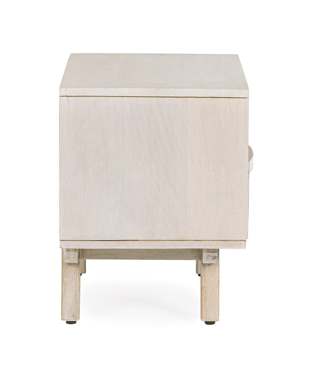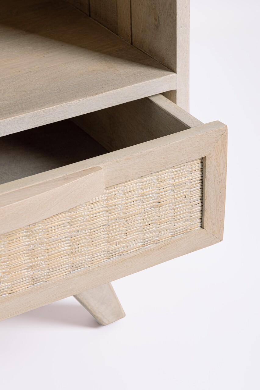 Mentiuni:Cadru din lemn de mango, spate si partea inferioara a sertarului din MDF.Partea din fata a sertarului este din ratan. Vopsea pe baza de nitroceluloza, finisaj alb cu aspect prespalat (wash color).Necesita asamblarea picioarelor.