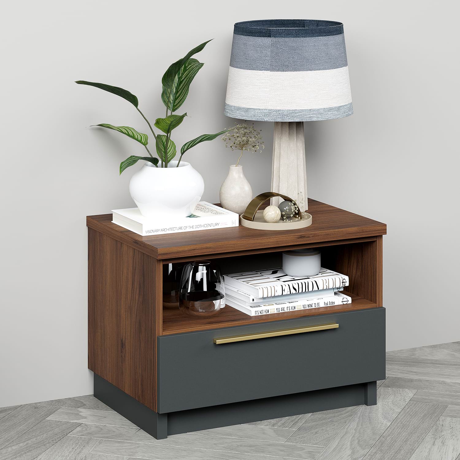 Noptiera SERENA 60×42, H44, 1S, Nuc Warmia, Antracit – Soliditate si eleganta clasica pentru casa ta!Combinatia dintre nuanta calda de Nuc Warmia si accentele sofisticate de Antracit evidentiaza perfect personalitatea comodei SERENA Realizata din materiale de calitate superioara, aceasta comoda impresioneaza prin stabilitate, detalii atent lucrate si functionalitate fara compromisuri.Puncte forte:Constructie robusta: PAL melaminat de grosime 16 si 25 mm, cu cant ABS de 1 mm pentru rezistenta sporita.Stabilitate perfecta: Picioare metalice reglabile Hafele, cu reglaj din interior, ce asigura o asezare corecta pe orice tip de pardoseala.Manere metalice de calitate: Sertarele sunt prevazute cu manere metalice elegante (negru sau auriu), ce adauga o nota clasica si durabilitate.Mecanisme premium: Sertare cu sisteme de inchidere soft Hafele – silentioase, rezistente, pentru o utilizare indelungata si confortabila.elementele de feronerie Hafele cu functie de inchidere soft asigura ca sertarele se inchid linistit si usor. glisiere cu bile Hafele Matrix BB S30, cu extragere totala si amortizare integrataRafinament si prospetime cu Nuc Warmia si AntracitComoda SERENA in varianta Nuc Warmia combinat cu alb aduce impreuna caldura naturala a lemnului cu stralucirea si luminozitatea albului. Este alegerea ideala pentru cei care vor sa creeze un spatiu primitor, cu accente elegante, pastrand totodata un aspect proaspat si curat. Nuanta de nuc scoate in evidenta detaliile clasice, iar finisajul alb ofera un plus de rafinament, potrivindu-se atat in decoruri traditionale, cat si moderne sau scandinave. Dimensiunilungime: 60cmlatime: 42cminaltime: 44cm MaterialeCarcasa – PAL melaminat Nuc Warmia Egger 16mmFronturi – PAL melaminat Alb 16mmPicioruse metalice reglabile 60mmDe ce sa alegi aceasta noptiera?Design personalizabil: Se potriveste perfect stilului tau – alege nuanțele care completeaza decorul dormitorului.Materiale rezistente si intretinere usoaraFuncționalitate maxima: Sertarele spațioase cu soft-close, picioarele reglabile o fac potrivita pentru orice nevoie.Montaj usor si livrare rapida. Garantie producator 24 luni Livrare GRATUITA in toata Romania…