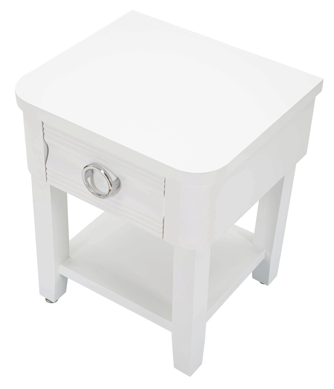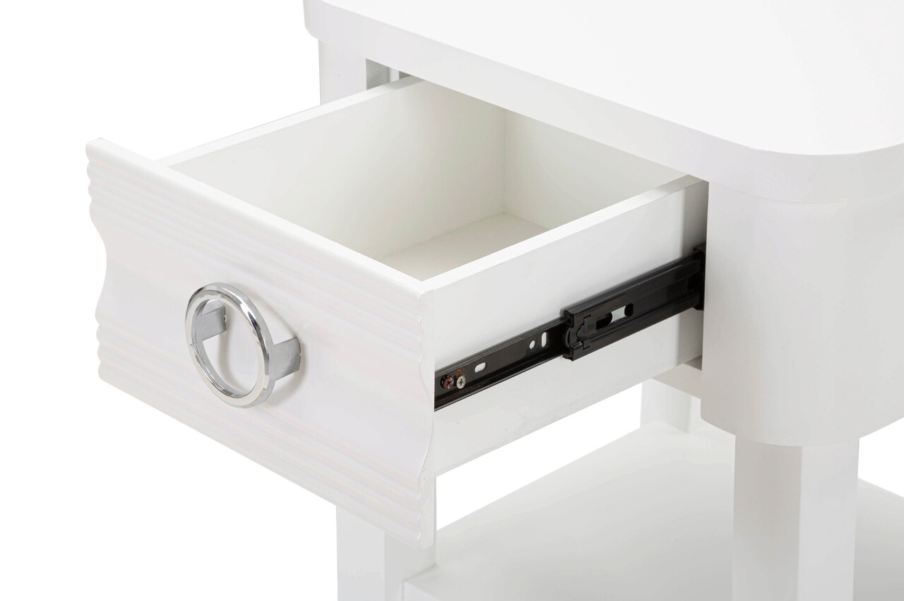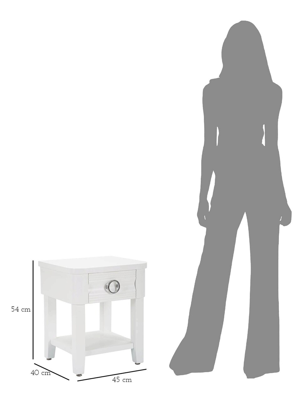 Noptiera cu sertar si raft, cu manopera simpla si linii elegante. Dimensiuni sertar: 21 x 28 x 11 cm. Distanta dintre raft si setar: 25 cm. Compozitie material: lemn de brad, MDF, metal.