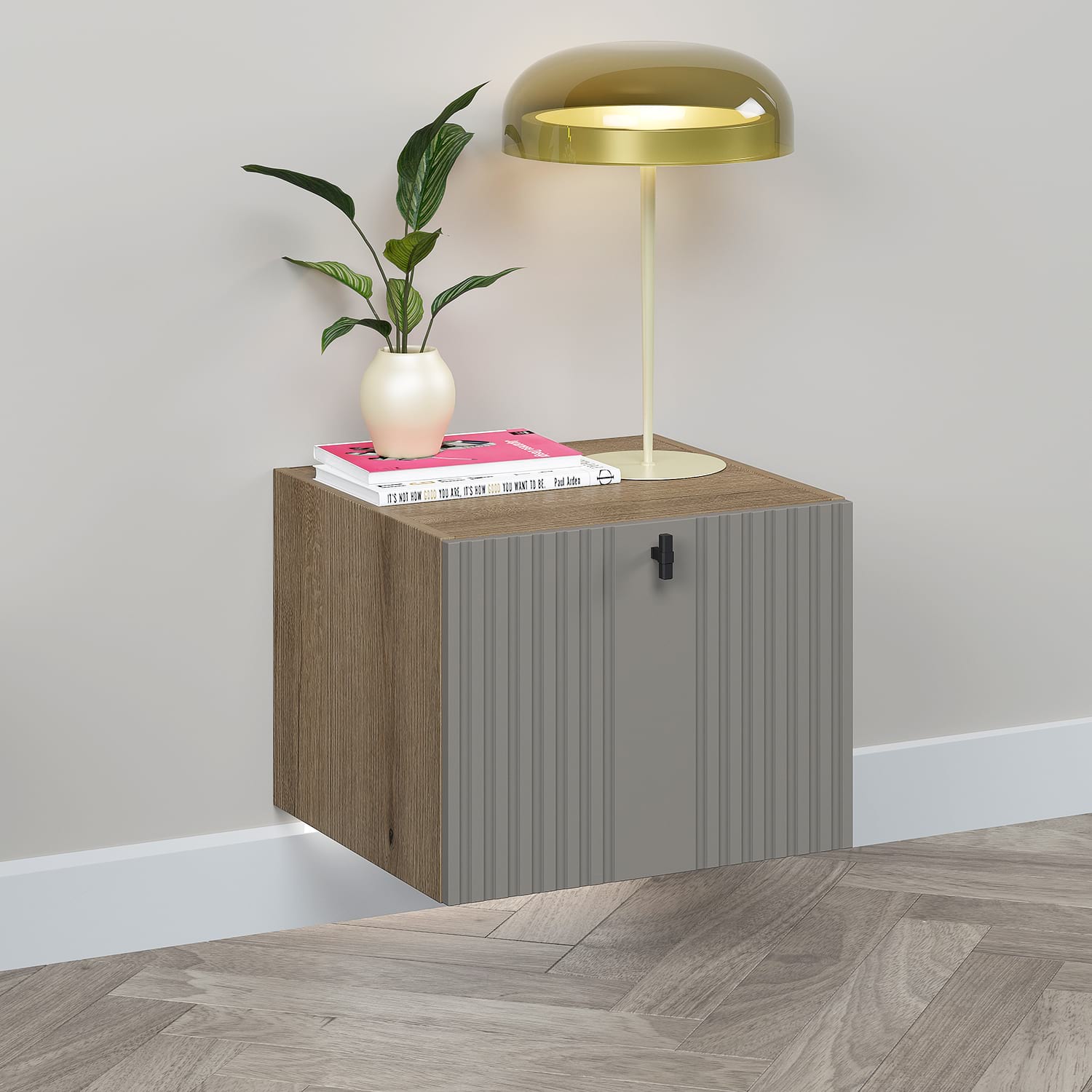 Exclusiv TAMOS! Fabricat in ROMANIA!Noptiera moderna cu front MDF riflat – personalizabila, funcționala si eleganta!Redefineste stilul dormitorului tau cu o piesa de mobilier ce imbina designul contemporan cu funcționalitatea si calitatea materialelor! Noptiera noastra cu usa din MDF frezata tip riflaj si finisaj vopsit gri piatra aduce o nota sofisticata in orice incapere. Caracteristici + Configurare flexibilaCarcasa solida din PAL de 16 mm – Durabila si stabila, in nuanțe neutre usor de integrat.Asamblare un sistem rastex/cama si cepi de lemnPFL inserat in nut pentru un plus de rezistențaUsa cu deschidere tip sustinere (tip bar) mecanism Hafele Duo standard – Acces facil si confort zilnic.Sistem de suspendare dulap cu reglaj – Stabilitate pe orice perete!Sistem suspendare dulap Hafele capacitate portanta 150 kg/perecheButoni metalici Made in Italy – Detaliu sofisticat, nu plastic!Configurație flexibila:– Culoare fronturi, butoni si picioare la alegere – Opțiune suspendare pe perete – Opțional: iluminare LED ambientala pentru un efect wow! Dimensiunilungime: 45cmlatime: 42cminaltime (fara picioare): 35cm MaterialeCarcasa – PAL Stejar 16mmUsa – MDF 16mm frezat tip riflaj R1, vopsit mat Gri PiatraDe ce sa alegi aceasta noptiera?Design personalizabil: Se potriveste perfect stilului tau – alege nuanțele care completeaza decorul dormitorului.Materiale premium: Detaliile fac diferența – de la fronturile riflate la butonii metalici.Funcționalitate maxima: Sertarele spațioase cu soft-close, picioarele reglabile si opțiunea de suspendare o fac potrivita pentru orice nevoie.Montaj usor si livrare rapida. Garantie producator 24 luni Livrare GRATUITA in toata Romania…