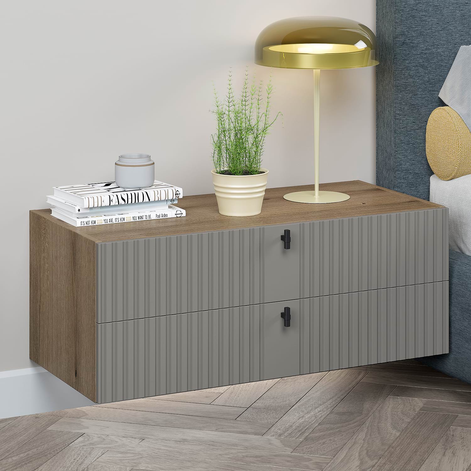 Exclusiv TAMOS! Fabricat in ROMANIA!Noptiera suspendata cu front MDF riflat – personalizabila, funcționala si eleganta!Redefineste stilul dormitorului tau cu o piesa de mobilier ce imbina designul contemporan cu funcționalitatea si calitatea materialelor! Noptiera noastra cu fronturi din MDF frezate tip riflaj si finisaj vopsit gri piatra aduce o nota sofisticata in orice incapere. Caracteristici + Configurare flexibilaCarcasa solida din PAL de 16 mm – Durabila si stabila, in nuanțe neutre usor de integrat.Asamblare un sistem rastex/cama si cepi de lemnPFL inserat in nut pentru un plus de rezistențaSertare cu glisare soft-close – Inchidere silențioasa si confort zilnic.Glisiere cu bile Hafele Matrix BB S30, cu extragere totala si amortizare integrata (lungime 35cm)Sistem de suspendare dulap cu reglaj – Stabilitate pe orice perete!Sistem suspendare dulap Hafele capacitate portanta 150 kg/perecheButoni metalici Made in Italy – Detaliu sofisticat, nu plastic!Configurație flexibila:– Culoare fronturi, butoni si picioare la alegere – Opțiune suspendare pe perete – Opțional: iluminare LED ambientala pentru un efect wow! Dimensiunilungime: 90cmlatime: 42cminaltime: 35cm MaterialeCarcasa – PAL melaminat Stejar 16mmFronturi – MDF 16mm frezat tip riflaj R1, vopsit mat Gri PiatraDe ce sa alegi aceasta noptiera?Design personalizabil: Se potriveste perfect stilului tau – alege nuanțele care completeaza decorul dormitorului.Materiale premium: Detaliile fac diferența – de la fronturile riflate la butonii metalici.Funcționalitate maxima: Sertarele spațioase cu soft-close, picioarele reglabile si opțiunea de suspendare o fac potrivita pentru orice nevoie.Montaj usor si livrare rapida. Garantie producator 24 luni Livrare GRATUITA in toata Romania…