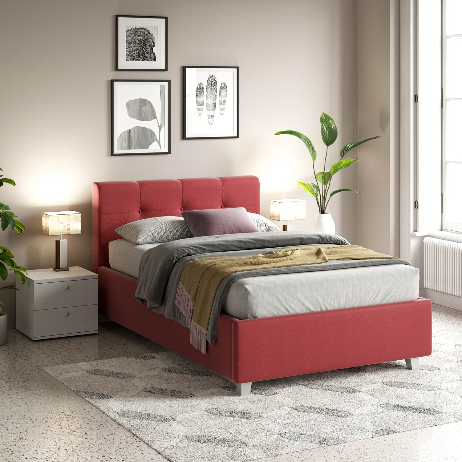 Pachet PROMO compus din Pat tapitat de o persoana ARISA 120x200cm, stofa Rosie + Saltea Ortopedica Spuma 120x200x15cmPatul tapitat de o persoana ARISA, 120×200, stofa Rosie reprezinta o alegere potrivita pentru cei ce cauta avantajele unui pat tapitat robust la pret foarte accesibil. Tapiteria de stofa Rosie, foarte rezistenta la uzura, adauga un aspect sofisticat si se poate integra cu usurinta in orice stil de design interior, de la contemporan la clasic.Patul tapitat ARISA cu suport saltea Forte, din stofa Rosie este fabricat de TAMOS din materiale de calitate, rezistente in timp, in tendinte actuale de design. Pat configurabilconfigurezi husa (piele ecologica, stofa,catifea)configurezi dimensiune pat configurezi complemente Dimensiuni PatLungime=220cm x latime=130cm x Inaltime=100cm ( dimensiune saltea 200 x 120cm)Salteaua Ortopedica Spuma, 120×200 de grosime 15cm, face parte din linia de saltele Ortopedice Spuma.Dimensiuni:lungime: 200 cmlatime: 120 cminaltime (grosime): 15 cmCaracteristici si avantaje saltea ortopedica cu spuma:Grad ridicat de confort datorita spumei poliuretanice prelucrata specialMaterial flexibil, durabilPermite circulatia cu usurinta a aerului in interiorul saltelei, prevenind astfel transpiratia corpului in timpul somnuluiRigiditate medieInvelis exterior din material de tip tricotGarantie 2 aniMobilier kit, se livreaza demontat, ambalat in cutii de cartonKitul contine schita montaj, feronerie, certificat garantie si conformitateSuport saltea Forte cu structura metalica si elemente suport din PAL dur 16mmPicioare lemn fag vopsite argintiuCusaturi de tapiterie cu banda de intarire Texturi Patstofa Rosie Garantie 24 luni Transport GRATUITTransport GRATUIT in toata tara . Produsele se preiau de la masina.*NOTA* Imaginile afisate sunt doar pentru scopuri ilustrative. Dimensiunile reale ale produsului pot diferi usor fata de cele prezentate. De asemenea, culorile pot varia in functie de setarile dispozitivului dvs. Va rugam sa verificati specificatiile produsului pentru detalii exacte si sa va asigurati ca este decorul dorit.*Noptiera, lenjeria si celelalte acesorii din imagine nu sunt incluse in pret….