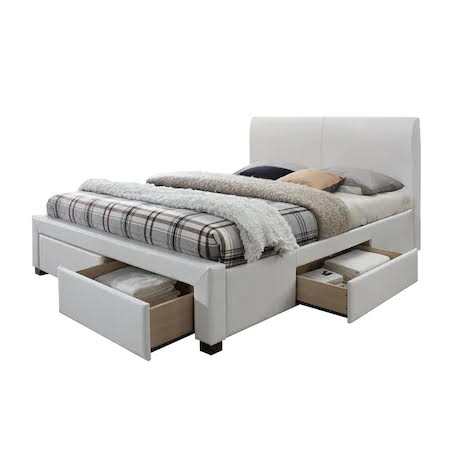 Pat dublu cu design modern, tapitat cu piele ecologica alba. Dimensiune generoasa, compatibil cu saltea 160 x 200 cm Spatii multiple de depozitare, seratare frontale si laterale. Cadru rezistent din lemn cu picioare din lemn de culoarea alunului. Include somiera. Nu este inclusa salteaua. Dimensiuni: lungime: 220 cm, latime: 164 cm, inaltime: 106 cm, CARACTERISTICI…